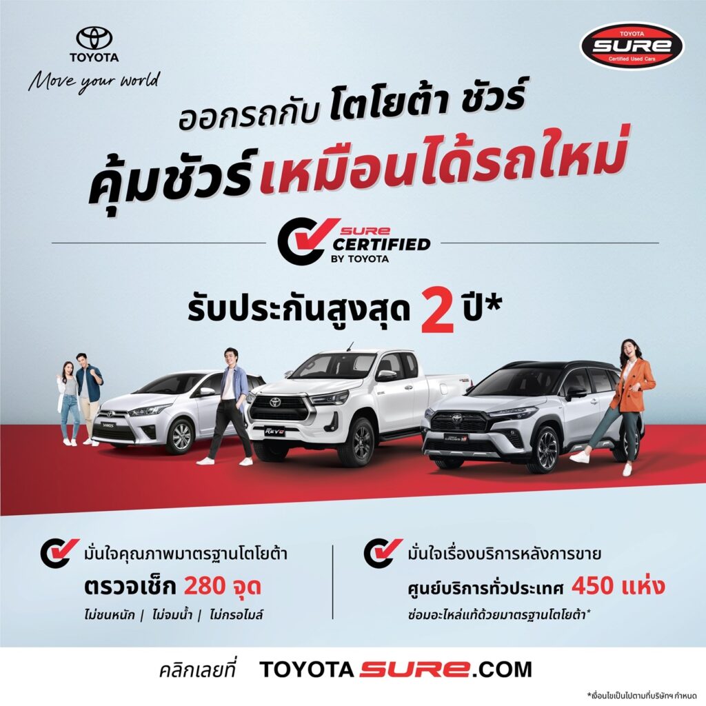 โตโยต้ามุ่งมั่นสร้างความสบายใจให้แก่ลูกค้าตลอดการใช้รถ นำเสนอธุรกิจ Toyota Sure บริการทางเลือกสำหรับการซื้อ-ขายต่อรถยนต์ใช้แล้วคุณภาพดี ในราคาสมเหตุสมผล ที่มีมาตรฐานการประเมินสภาพรถ TVI โดยทีมงานผู้เชี่ยวชาญ (inspector) และควบคุมมาตรฐานการดำเนินการภายใต้ บริษัท โตโยต้า มอเตอร์ ประเทศไทย จำกัด พร้อมตอกย้ำความเชื่อมั่นเรื่องราคาขายต่อ และมูลค่ารถยนต์มือสอง ผ่านบริการประเมินราคารถด้วยมาตรฐานราคากลางฟรี