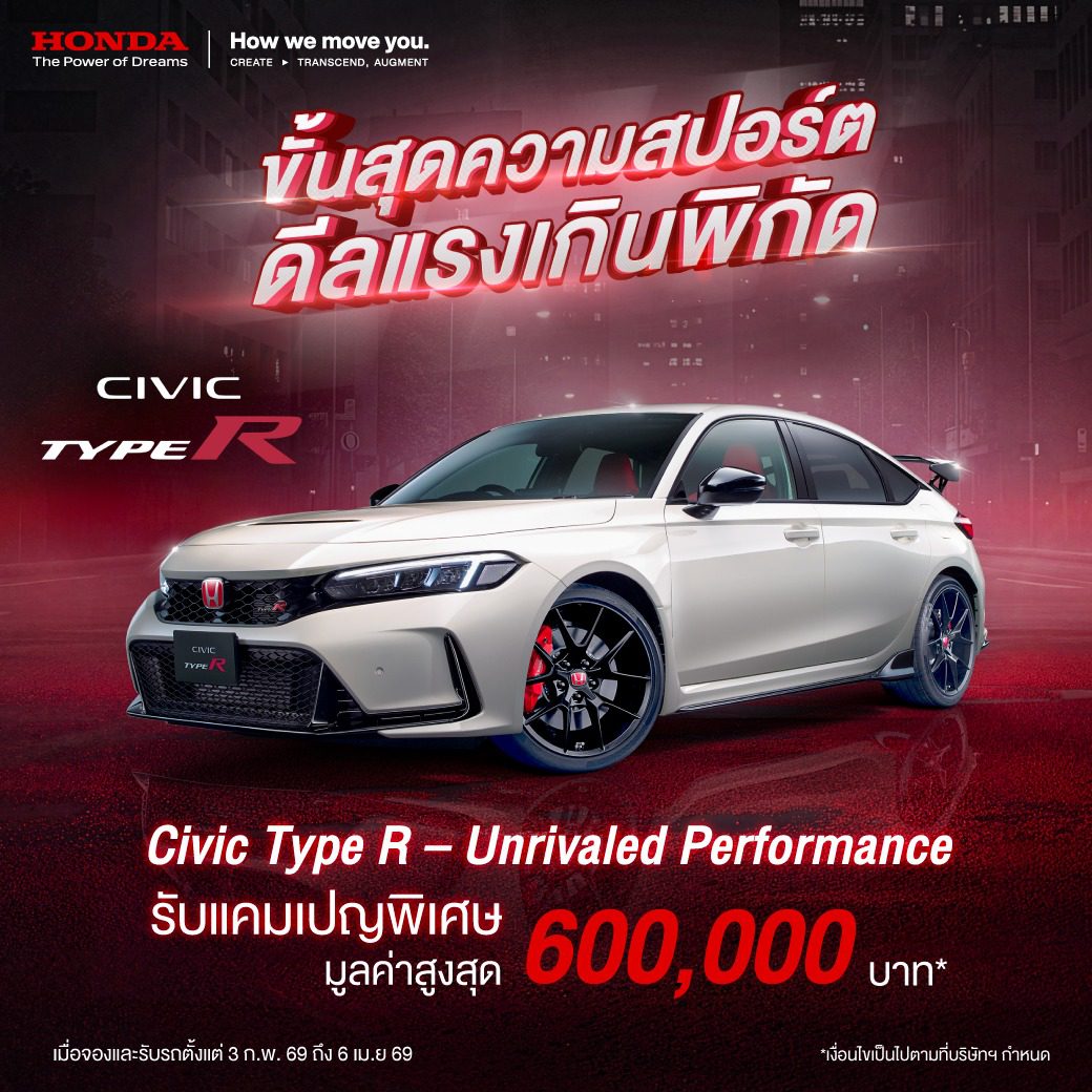 บริษัท ฮอนด้า ออโตโมบิล (ประเทศไทย) จำกัด เปิดดีลโดนใจสายสปอร์ตกับแคมเปญ “Civic Type R – Unrivaled Performance” จัดเต็มด้วยข้อเสนอสุดพิเศษเกินต้าน พร้อมสิทธิประโยชน์แบบ 2 ต่อ ที่มอบให้ทั้งลูกค้าและผู้แนะนำ เมื่อจองและรับรถตั้งแต่ วันที่ 3 กุมภาพันธ์ 2569 – 6 เมษายน 2569 ที่โชว์รูมและศูนย์บริการฮอนด้าทั่วประเทศ