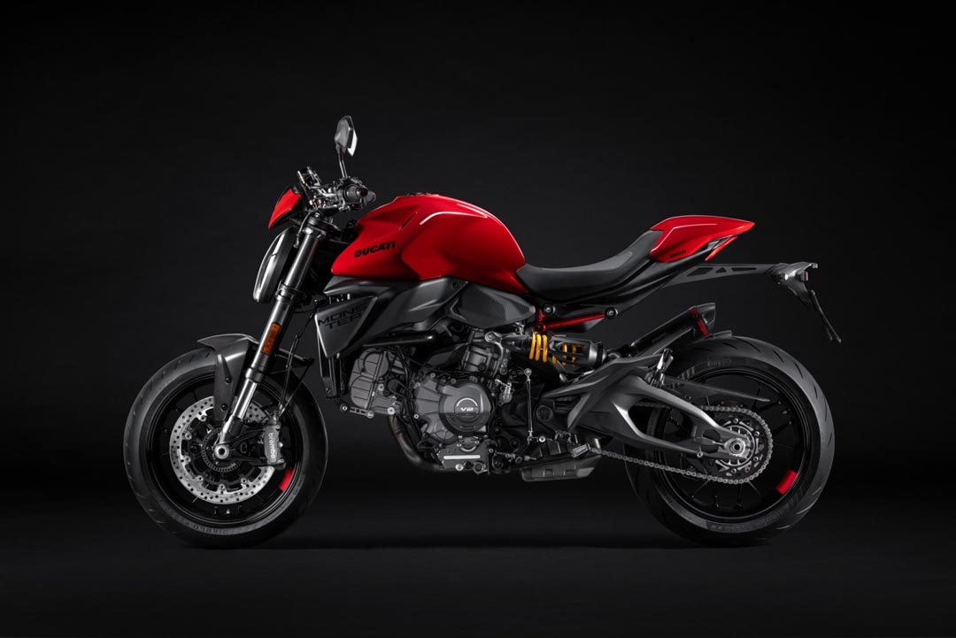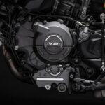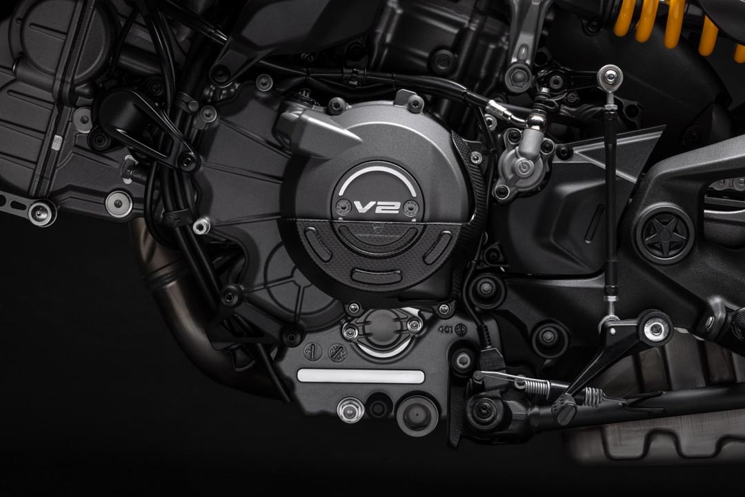 เครื่องยนต์ Ducati V2 รุ่นล่าสุด ถือเป็นหัวใจสำคัญ ที่ถูกออกแบบมาให้มีการกระจายน้ำหนักที่สมดุลมากขึ้น ลดแรงสั่นสะเทือน ซึ่งช่วยให้การขับขี่มีความนุ่มนวลและควบคุมได้ง่าย เครื่องยนต์รุ่นใหม่นี้มีน้ำหนักเบาลง 5.9 กิโลกรัม เมื่อเทียบกับ Testastretta รุ่นก่อนหน้า และมาพร้อมระบบวาล์วแปรผัน IVT (Intake Variable Timing) ที่ช่วยให้เครื่องยนต์สามารถผสานความนุ่มนวลในรอบต่ำ แรงดึงในรอบกลาง และ พละกำลังในรอบสูง โดยให้กำลังสูงสุด 111 แรงม้า ที่ 9,000 รอบ/นาที และให้แรงบิด 70% ของแรงบิดสูดสุดตั้งแต่ที่ 3,000 รอบ/นาที และยังคงแรงบิด 80% ของแรงบิดสูงสุดไว้ให้ใช้งานตั้งแต่ 4,000 – 10,000 รอบ/นาที นอกจากนี้ผู้ขับขี่ยังสามารถสนุกกับการขับขี่ได้อย่างเต็มที่ ลดความกังวลเรื่องค่าบำรุงรักษา เพราะเครื่องยนต์ V2 รุ่นล่าสุด สามารถยืดระยะเวลา Maintenance Service ได้นานขึ้น โดยมีระยะการตรวจตั้งวาล์วที่ 45,000 กิโลเมตร ซึ่งถือเป็น 1 ในมาตรฐานที่ดีที่สุดในกลุ่มรถจักรยานยนต์ระดับเดียวกัน