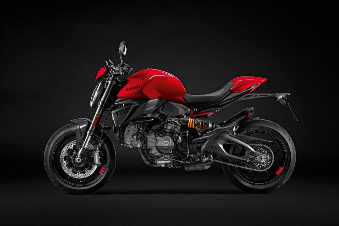 โครงสร้างสปอร์ต น้ำหนักเบา และควบคุมง่าย โดยใช้เฟรมแบบ Monocoque พร้อมสวิงอาร์มคู่ที่ได้รับแรงบันดาลใจจาก Panigale V4 ซี่งโครงสร้างนี้ช่วยให้ Monster ใหม่มีน้ำหนักเบาลงถึง 4 กิโลกรัม เมื่อเทียบกับรุ่นก่อนหน้า โดยมีน้ำหนักรวม 175 กิโลกรัม (ไม่รวมเชื้อเพลิง) Monster รุ่นใหม่มาพร้อมช่วงล่างที่ใช้ระบบกันสะเทือนหน้าจาก Showa Upside-down ขนาด 43 มม. และ โช้คหลัง Showa monoshock ปรับพรีโหลดได้ พร้อมระบบเบรกจาก Brembo ใช้ดิสก์หน้าคู่ขนาด 320 มม. พร้อมคาลิเปอร์ M4.32 radial และยาง Pirelli Diablo Rosso IV ขนาด 120/70 และ 180/55 มอบการยึดเกาะและความปลอดภัยสูงสุดสำหรับการใช้งานบนถนน