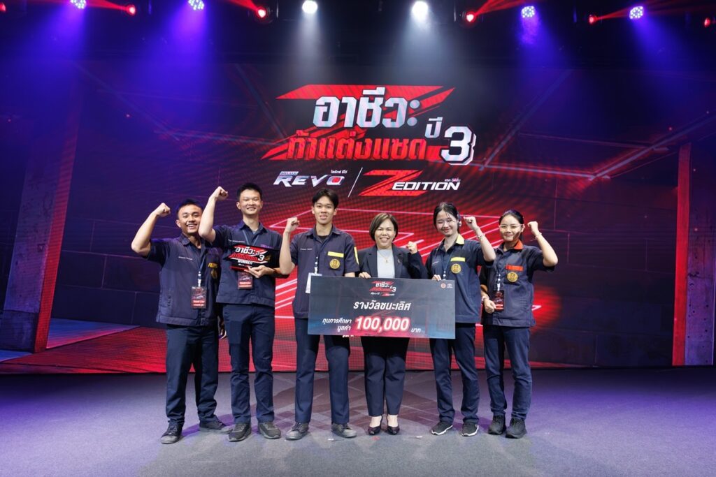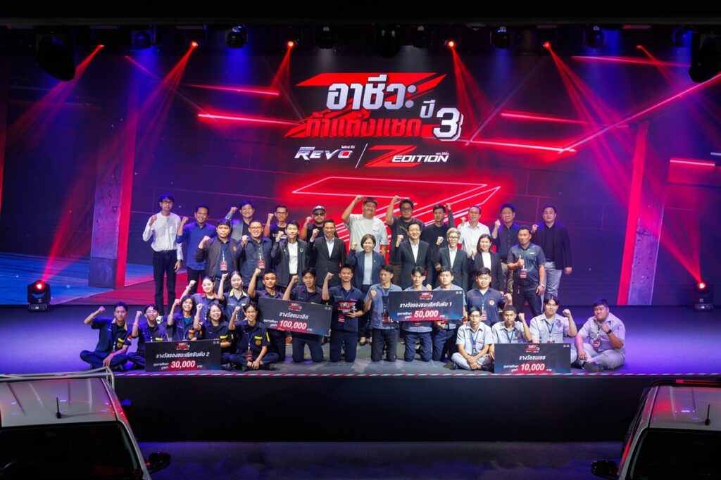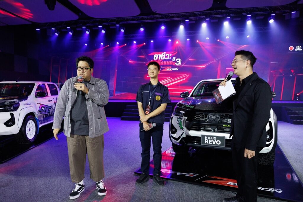 นายณัทธร ศรีนิเวศน์ ผู้ช่วยกรรมการผู้จัดการใหญ่ บริษัท โตโยต้า มอเตอร์ ประเทศไทย จำกัด พร้อมด้วย นางเบญจวรรณ ปกป้อง ผู้อำนวยการสำนักความร่วมมือ สำนักงานคณะกรรมการการอาชีวศึกษา กระทรวงศึกษาธิการ นายศุภชัย แพร่พิพัฒน์มงคล ประธานชมรมผู้แทนจำหน่ายฯ เขตภาคตะวันออก ร่วมมอบรางวัลผู้ชนะการประกวดแต่งรถกระบะไฮลักซ์ รีโว่ แซด อิดิชั่น ภายใต้กิจกรรม “อาชีวะ ท้าแต่งแซด กับ ไฮลักซ์ รีโว่ แซด อิดิชั่น ปี 3” เมื่อวันที่ 11 มีนาคม 2569 ณ TOYOTA ALIVE บางนา กม.3