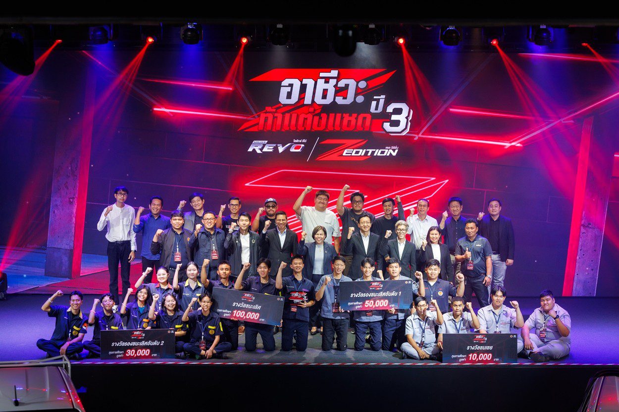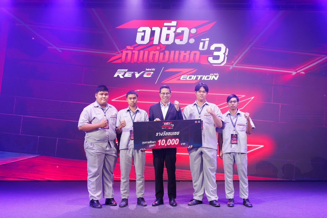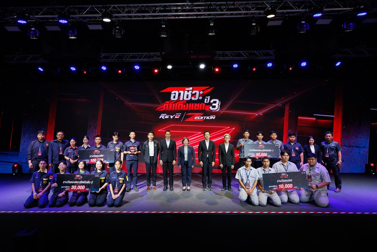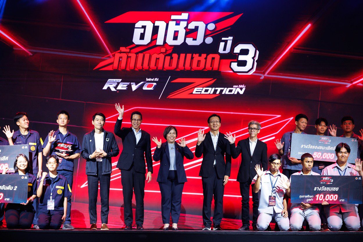นายณัทธร ศรีนิเวศน์ ผู้ช่วยกรรมการผู้จัดการใหญ่ บริษัท โตโยต้า มอเตอร์ ประเทศไทย จำกัด พร้อมด้วย นางเบญจวรรณ ปกป้อง ผู้อำนวยการสำนักความร่วมมือ สำนักงานคณะกรรมการการอาชีวศึกษา กระทรวงศึกษาธิการ นายศุภชัย แพร่พิพัฒน์มงคล ประธานชมรมผู้แทนจำหน่ายฯ เขตภาคตะวันออก ร่วมมอบรางวัลผู้ชนะการประกวดแต่งรถกระบะไฮลักซ์ รีโว่ แซด อิดิชั่น ภายใต้กิจกรรม “อาชีวะ ท้าแต่งแซด กับ ไฮลักซ์ รีโว่ แซด อิดิชั่น ปี 3” เมื่อวันที่ 11 มีนาคม 2569 ณ TOYOTA ALIVE บางนา กม.3