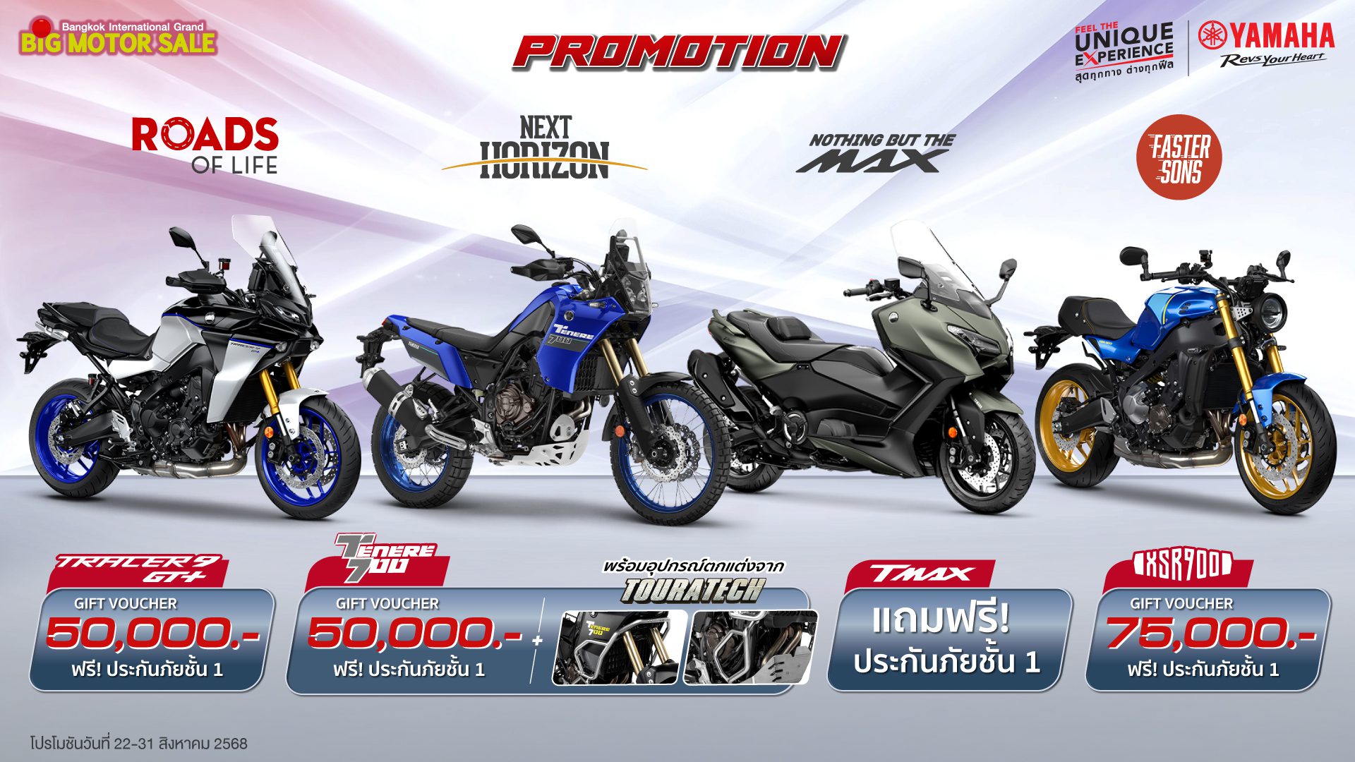 บริษัท ไทยยามาฮ่ามอเตอร์ จำกัด จัดเต็มโปรโมชันสุดพิเศษ เมื่อซื้อรถจักรยานยนต์ยามาฮ่าทุกรุ่นภายในงาน บิ๊ก มอเตอร์เซล 2025  จัดเต็ม! Gift Voucher ส่วนลดสูงสุด 75,000 บาท พร้อมประกันภัยชั้น 1 เมื่อซื้อ XSR900 หรือเลือกซื้อ MT-07 รับ Gift Voucher ส่วนลดสูงสุด 61,500 บาท พร้อมประกันภัยชั้น 1 ซื้อ MT-09 Y-AMT, Tracer9 GT+ และ Tenere700 รับ Gift Voucher 50,000 บาท และประกันภัยชั้น 1 พร้อมพิเศษชุดแต่งจาก Touratech สำหรับ Tenere700 ซื้อ R7 รับ Gift Voucher  26,000 บาท พร้อมประกันภัยชั้น 1 ซื้อ MT-09SP รับทันที Gift Voucher  20,000 บาท พร้อมประกันภัยชั้น 1 และ ซื้อ New TMAX 2025 รับฟรีประกันภัยชั้น 1
