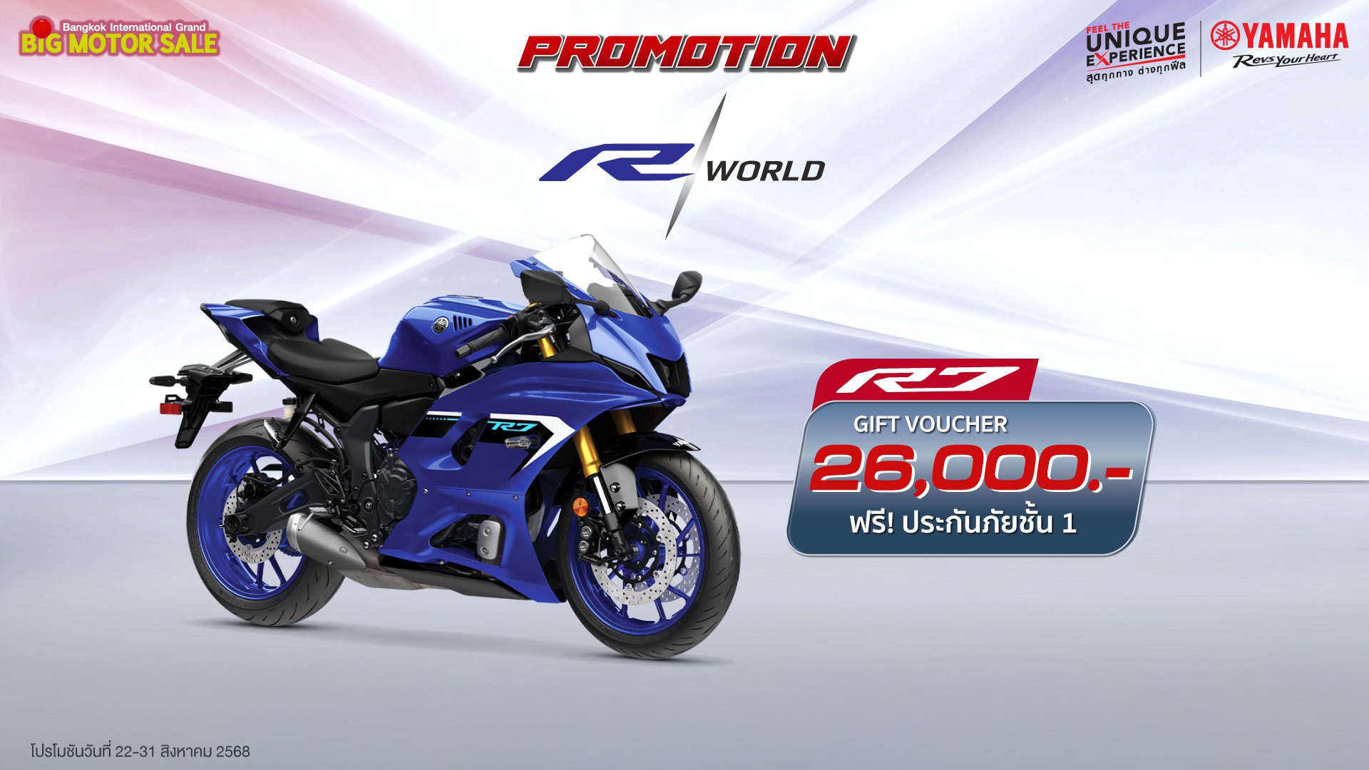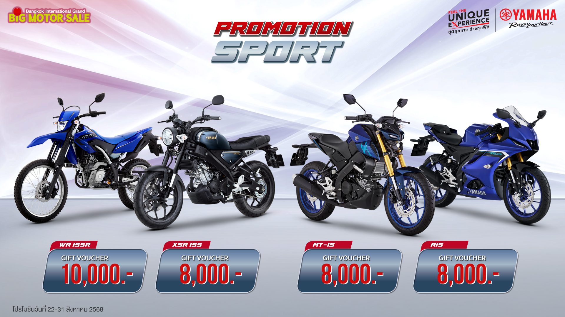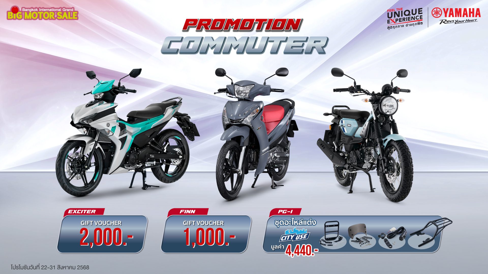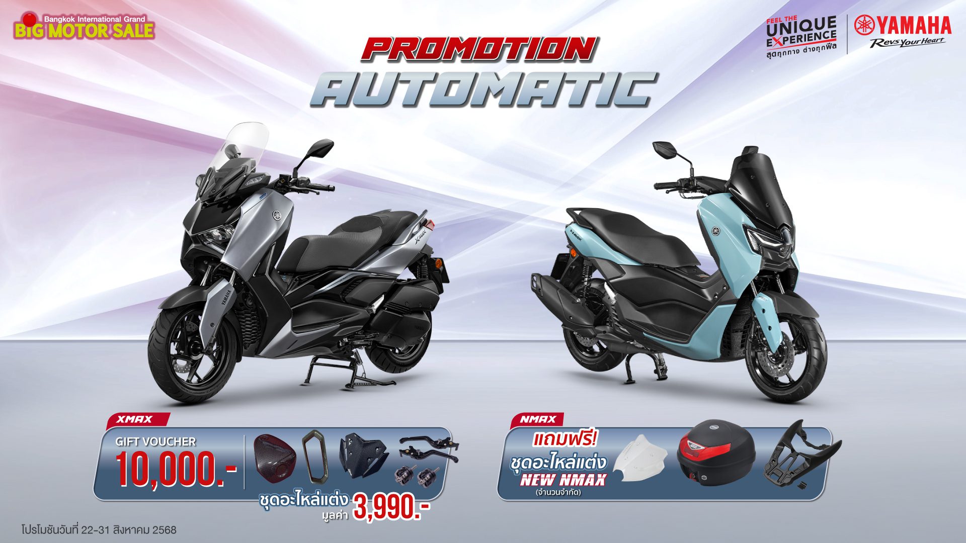 พบกับโปรโมชันสุดพิเศษจากยามาฮ่าได้ที่ บูธ  YAMAHA Feel the Unique Experience สุดทุกทาง…ต่างทุกฟีล สุดทุกเส้นทางในรูปแบบที่เป็นคุณ ในงาน BIG MOTOR SALE 2025 ได้ระหว่างวันที่ 22 – 31 สิงหาคม 2568 นี้