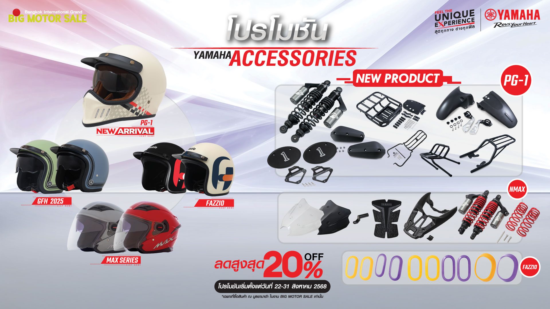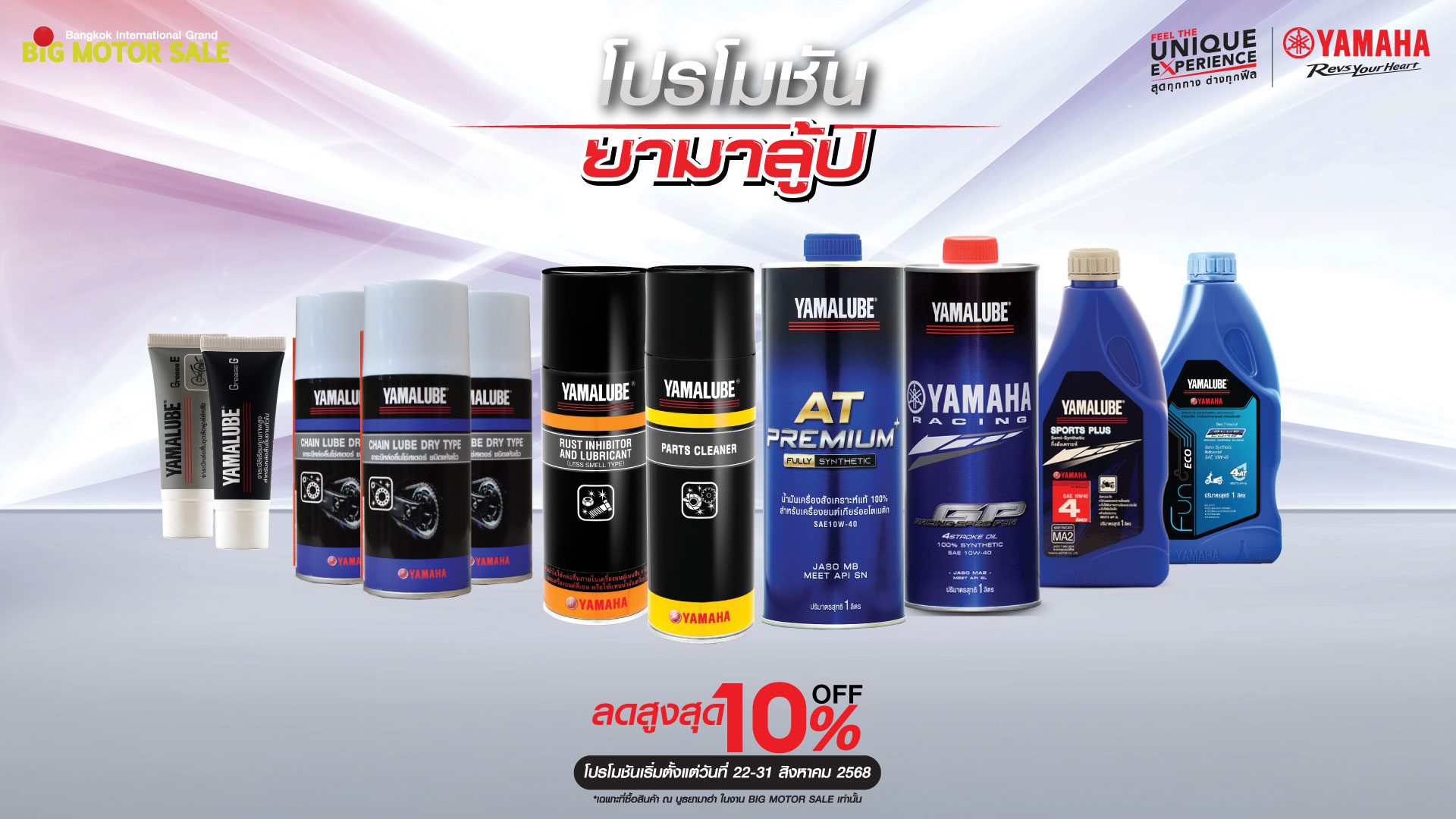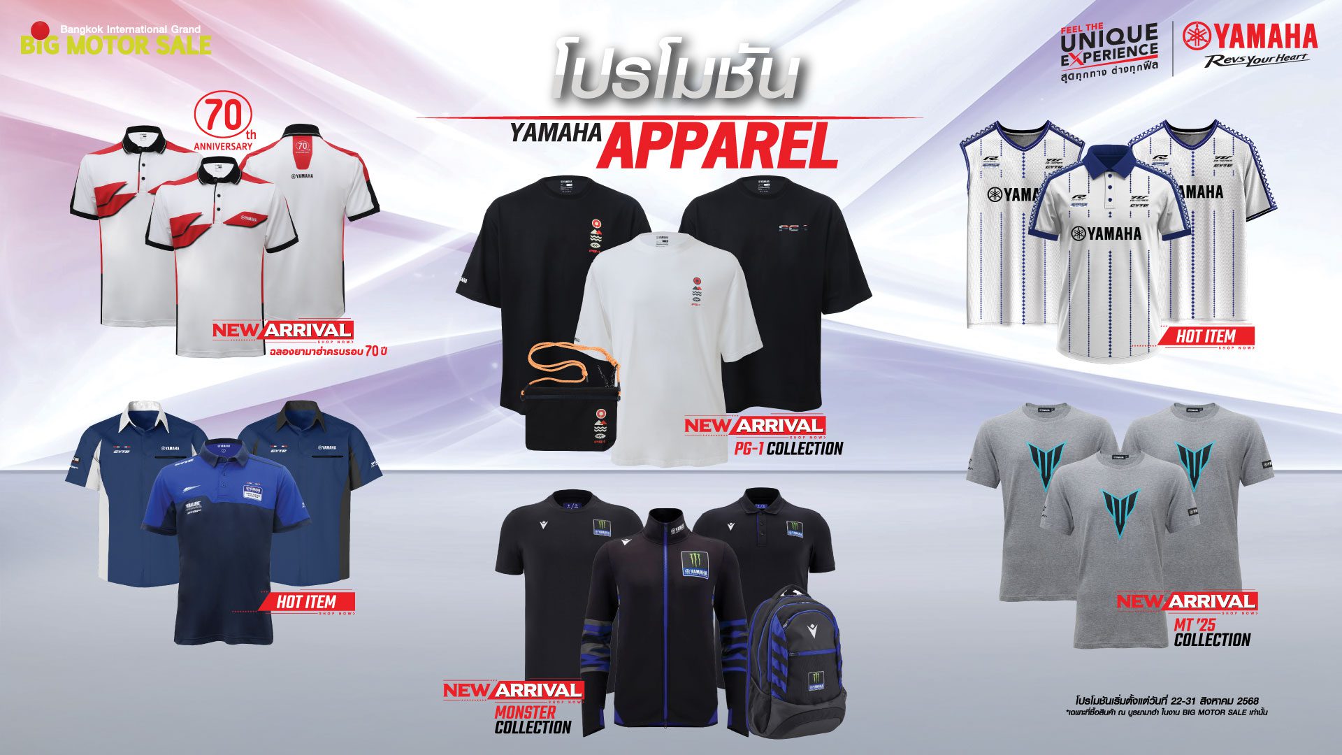 พร้อมกับส่วนลดสูงสุด 50% สำหรับเสื้อผ้า และเครื่องแต่งกายลิขสิทธิ์แท้ยามาฮ่า หมวกกันน็อกและอุปกรณ์ตกแต่งลดสูงสุด 20% ผลิตภัณฑ์ยามาลู้ปลดสูงสุด 10%
