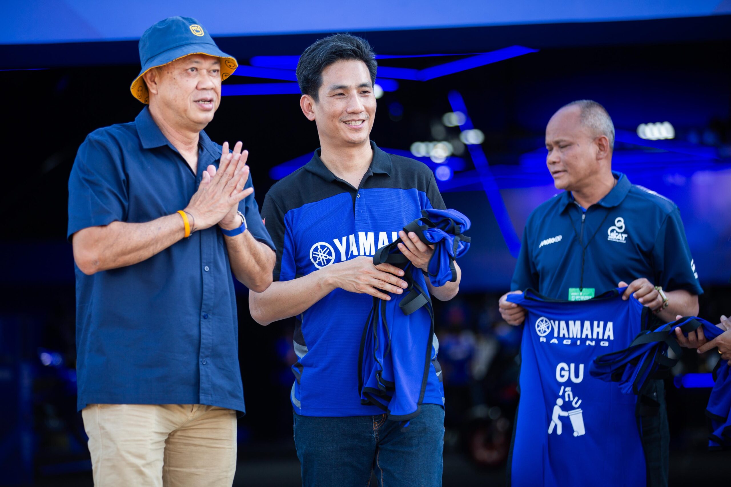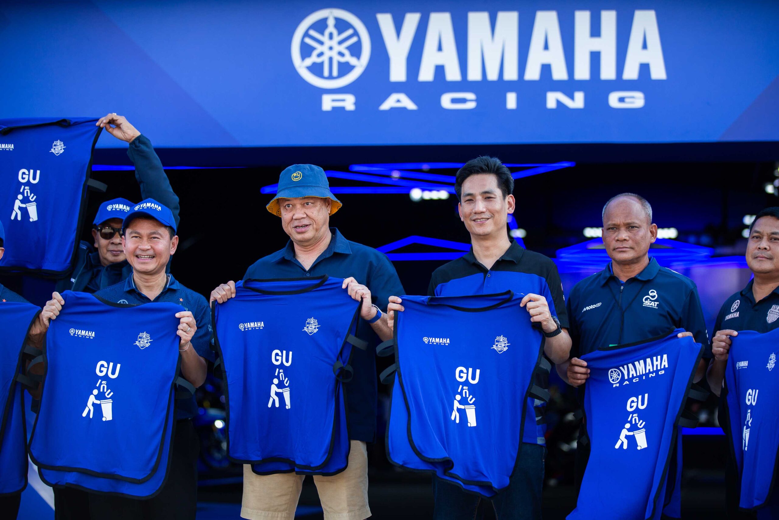นายอุกฤษณ์ ภาควิวรรธ รองผู้จัดการใหญ่ด้านวางแผนการค้า บริษัท ไทยยามาฮ่ามอเตอร์ จำกัด ถ่ายภาพร่วมกับ นายเนวิน ชิดชอบ ประธาน บริษัท บุรีรัมย์ยูไนเต็ด อินเตอร์เนชั่นแนลเซอร์กิต จำกัด พร้อมคณะรับมอบ เสื้อคลุมกันเปื้อน และหมวก GU เก็บ จำนวน 1,000 ชุด ให้กับคณะจิตอาสา ที่มาร่วมกันอำนวยความสะดวก และดูแลความสะอาดในพื้นที่ของสนามช้าง อินเตอร์เนชั่นแนล เซอร์กิต ช่วงการแข่งขัน MotoGP 2025 ระหว่างวันที่ 28 กุมภาพันธ์ – 2 มีนาคม 2568 เพื่อรองรับนักท่องเที่ยวทั้งชาวไทยและชาวต่างชาติ ที่มาร่วมงานในครั้งนี้ โดยการส่งมอบชุด GU เก็บ ในครั้งนี้มีขึ้น ณ YamahaGP Pavilion
