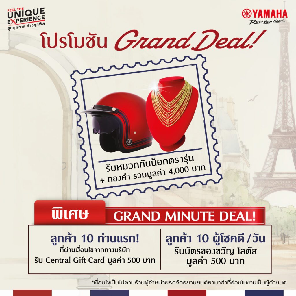 พร้อมกันนี้ ยามาฮ่ายังมอบโปรโมชันสุดพิเศษและสิทธิประโยชน์มากมายสำหรับผู้ที่ออกรถภายในงาน อาทิ รับหมวกกันน็อกตรงรุ่นพร้อมทองคำมูลค่ารวม 4,000 บาท เมื่อออกรถรุ่น YAMAHA GRAND FILANO HYBRID ลุ้นรับทองคำมูลค่า 13,500 บาท จำนวน 4 รางวัลสำหรับผู้ซื้อทุกรุ่น รับ Central Gift Voucher มูลค่า 500 บาทสำหรับลูกค้า 10 ท่านแรกที่ออกรถรุ่น YAMAHA GRAND FILANO HYBRID และพิเศษกับกิจกรรมนาทีทอง มอบบัตรของขวัญโลตัสมูลค่า 500 บาทแก่ผู้ที่ออกรถในช่วงเวลาที่กำหนดของแต่ละวัน