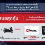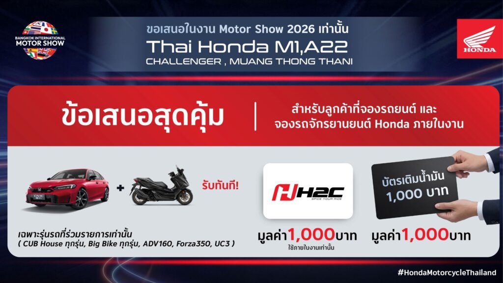รถจักรยานยนต์ฮอนด้า มอบข้อเสนอสุดคุ้ม เพื่อเติมเต็มทุกไลฟ์สไตล์การเดินทาง จัดเต็มสิทธิพิเศษ 2 ต่อ สำหรับลูกค้าที่จองรถยนต์ Honda ภายในงาน Motor Show 2026 ตั้งแต่วันที่ 25 มีนาคม – 5 เมษายน 2569