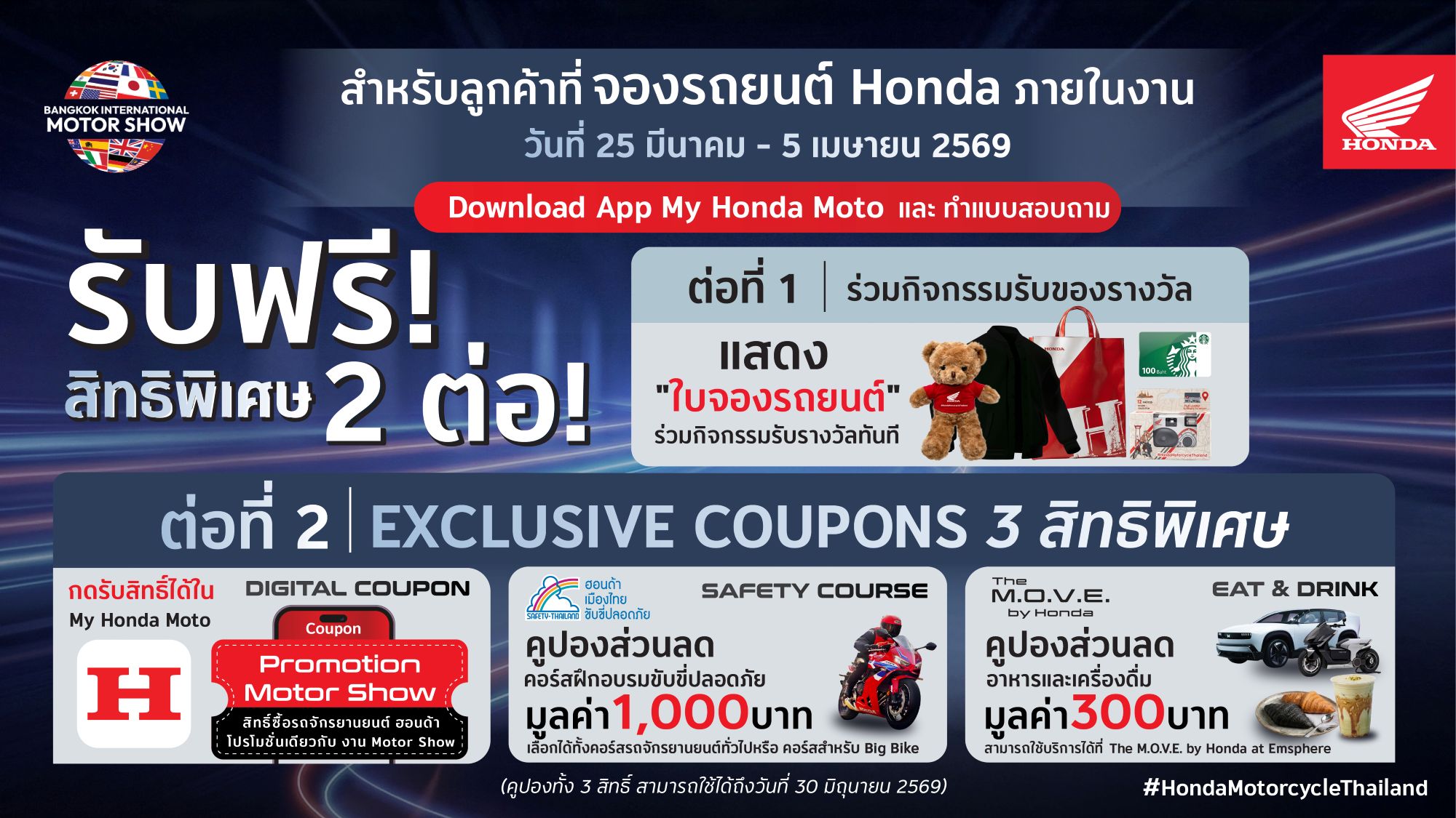 - Digital Coupon สิทธิ์ซื้อรถจักรยานยนต์ฮอนด้าโปรโมชั่นเดียวกับงาน Motor Show กดรับสิทธิ์ในคูปองส่วนลดสำหรับใช้จ่ายภายในงาน My Honda Moto(IOS: https://bit.ly/4urdJ5t Android: https://bit.ly/4b78vEi )
