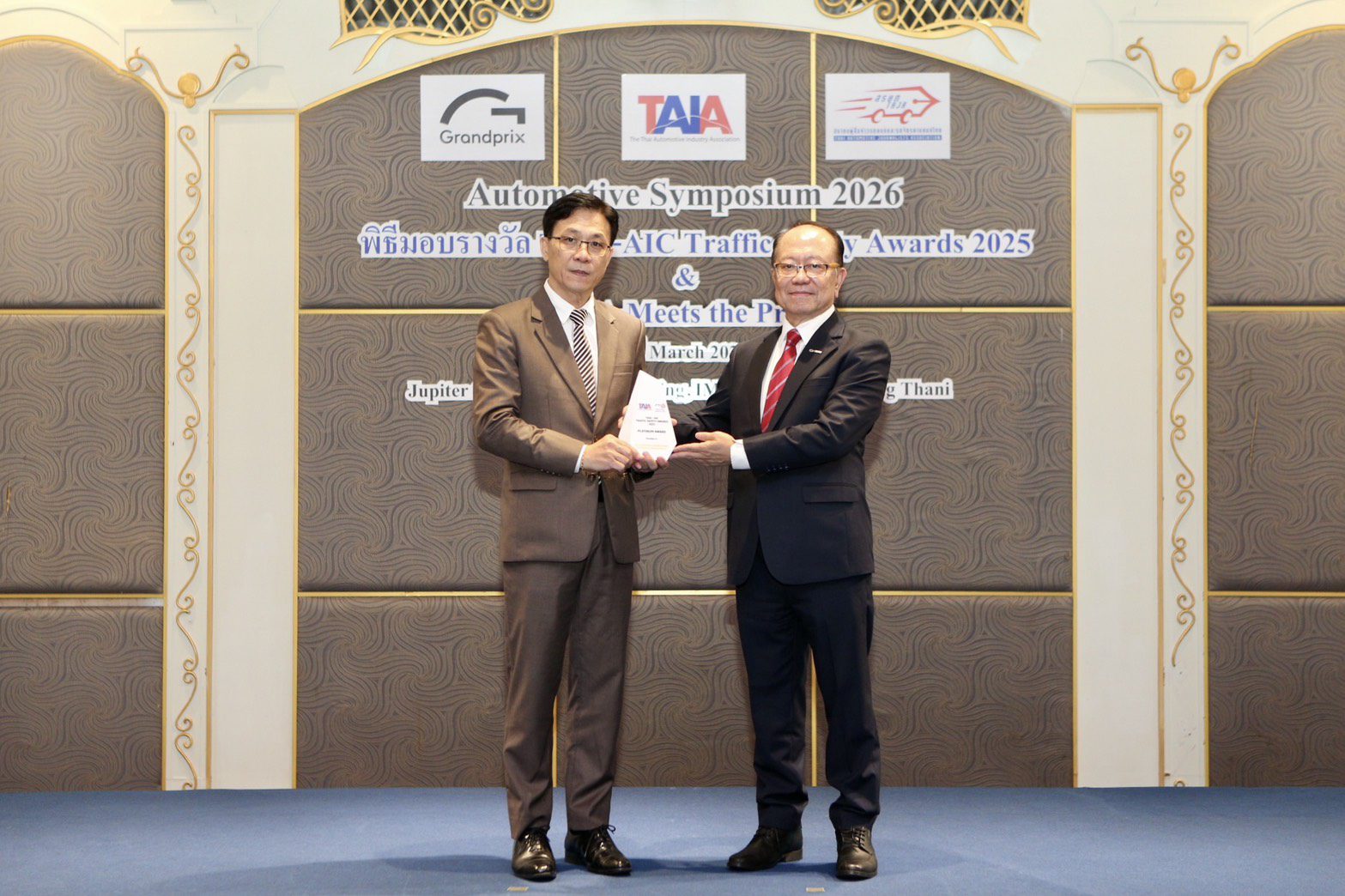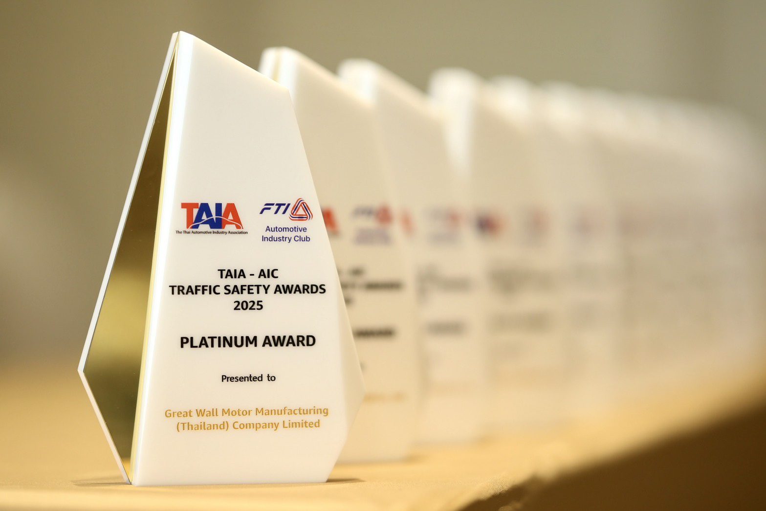 ภายในงานได้รับมอบรางวัลอันทรงเกียรติจากนายสุวัชร์ ศุภกาญจน์เดชากุล นายกสมาคมอุตสาหกรรมยานยนต์ไทย นายสุรศักดิ์ จรินทร์ทอง นายกสมาคมผู้สื่อข่าวรถยนต์และรถจักรยานยนต์ไทย และ ดร.ปราจิน เอี่ยมลำเนา ประธานกรรมการบริหาร บริษัท กรังด์ปรีซ์ อินเตอร์เนชั่นแนล จำกัด (มหาชน) โดยมี นายครรชิต ไชยสุโพธิ์ รองประธานฝ่ายกิจการองค์กรและรัฐกิจสัมพันธ์ เป็นตัวแทนจาก GWM (Thailand) เข้าร่วมรับรางวัล ภายในงาน “TAIA Meets the Press” ซึ่งได้รับเกียรติจากผู้บริหารระดับสูงจากอุตสาหกรรมยานยนต์ รถจักรยานยนต์ และภาคธุรกิจที่เกี่ยวข้องเข้าร่วมงานอย่างคับคั่ง สะท้อนถึงความร่วมมือของทุกภาคส่วนในการขับเคลื่อนมาตรฐานความปลอดภัยบนท้องถนนของประเทศไทยให้ก้าวสู่ระดับสากล