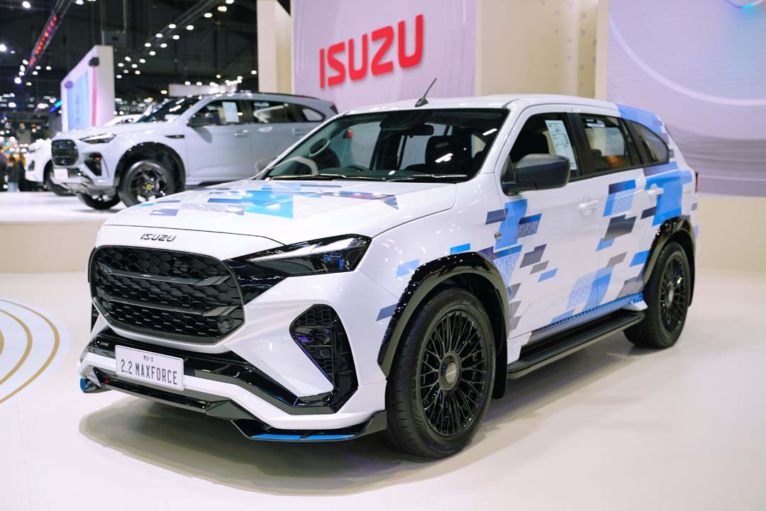 • MU-X “THE NEXT PEAK” รุ่น Active 2.2 Ddi MAXFORCE สีขาวมุกโดโลไมท์ (Dolomite White Pearl) ตกแต่งพิเศษด้วยคอนเซ็ปต์ “JAPANESE SPORT-SUV” สัญลักษณ์แห่งคุณภาพแบบญี่ปุ่น เน้นคุณภาพและความเชื่อมั่นที่วางใจได้ เสริมความโดดเด่นด้วยชุดแต่งบอดี้พาร์ทรอบคันจาก AKC ใส่ชุดโหลดช่วงล่างจาก PROFENDER เสริมลุคสปอร์ตด้วยล้ออัลลอย LENSO รุ่น JAGER APOLLO พร้อมยาง YOKOHAMA ADVAN SPORT ขนาด 265/50R20 ขนาด 20 นิ้ว หยุดรถได้อย่างมั่นใจด้วยระบบเบรกหน้า CALIPER แบบ 6 POT และเบรกหลัง CALIPER แบบ 4 POT พร้อมจานเบรกขนาด 355 มิลลิเมตร จาก Run Stop