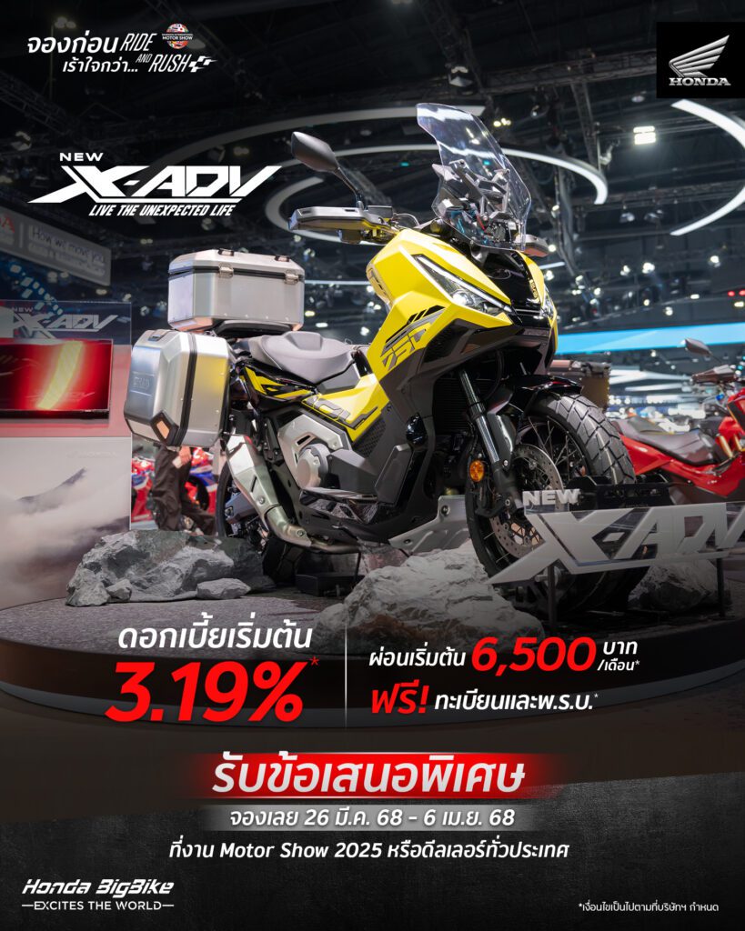 ฮอนด้าบิ๊กไบค์ ชวนสัมผัสที่สุดแห่งความเร้าใจจากทัพบิ๊กไบค์ 750 Series ที่จัดแสดงในงาน Motor Show 2025 นำโดย New Honda Forza 750  สปอร์ตทัวริ่ง ดุดัน ดีไซน์พรีเมียมที่เปิดตัวอย่างเป็นทางการครั้งแรกในประเทศไทย และ New Honda X-ADV รุ่นใหม่ล่าสุดที่มาพร้อมสีใหม่และเทคโนโลยีล้ำสมัย ร่วมด้วยโปรโมชันสุดร้อนแรง RIDE AND RUSH จองก่อนเร้าใจกว่า” ที่มอบดีลพิเศษเฉพาะในงานเท่านั้น 3 วันสุดท้าย! รีบมาพบกับข้อเสนอที่ดีที่สุดแห่งปี และชมคันจริงแบบใกล้ชิด ในงาน บางกอก อินเตอร์เนชั่นแนล มอเตอร์โชว์ ครั้งที่ 46 ถึงวันที่ 6 เมษายน 2568 นี้เท่านั้น!