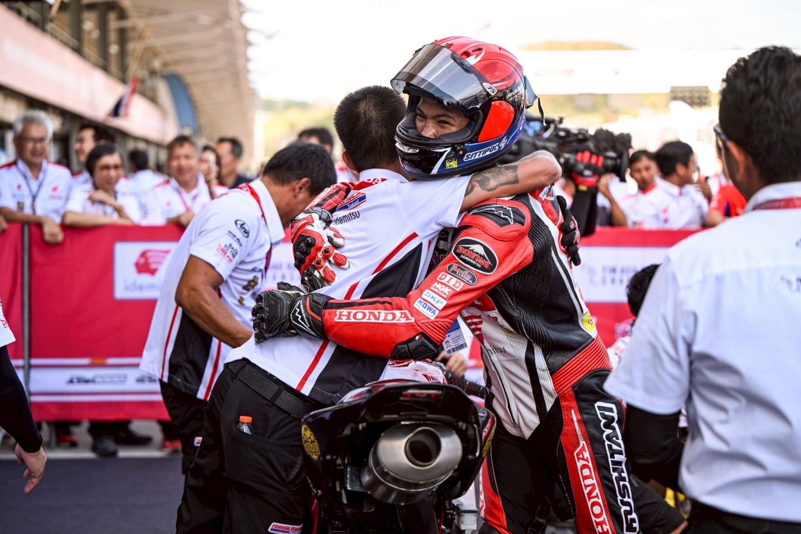 รุ่นซูเปอร์สปอร์ต 600 ซีซี (SS600) เรซที่ 2 “ไฮเปค” กฤษฎา ธนะโชติ เดินหน้าทำผลงานที่ดีขึ้นอีกระดับ ออกสตาร์ตการแข่งขันจากกริดที่ 10 บิด Honda CBR600RR ที่ท็อปฟอร์มอย่างมากดวลความเร็วกับคู่แข่งระดับหัวแถวของเอเชีย ไล่แซงทำอันดับขึ้นมาได้อย่างสะใจกองเชียร์ชาวไทย ถึงประสบการณ์จะเป็นรองเพราะเป็นปีแรกที่ได้ลงแข่งขัน แต่สามารถขึ้นมารั้งอันดับผู้นำในช่วง 3 รอบสุดท้ายและดวลกับคู่แข่งเพื่อลุ้นวินเนอร์ถึงเส้นชัย ก่อนคว้าโพเดียมอันดับที่ 2 มาครอง เป็นโพเดียมแรกที่ “ไฮเปค” คว้ามาครองหลังจากที่ไทยฮอนด้า ผลักดันส่งลงสนามแข่งขันรายการระดับชิงแชมป์เอเชียเป็นปีแรก ในศึก FIM Asia Road Racing Championship 2025 สนามที่ 4 ที่สนามเปอร์ตามิน่า มัลดาลิกา อินเตอร์เนชั่นแนลเซอร์กิต ประเทศอินโดนีเซีย