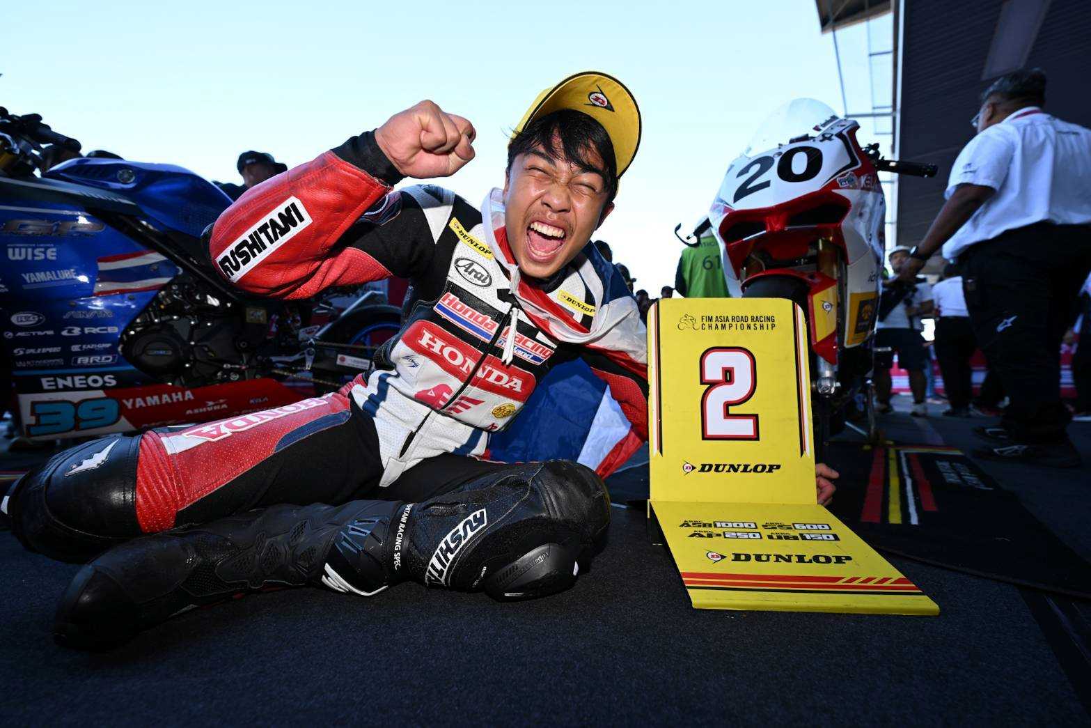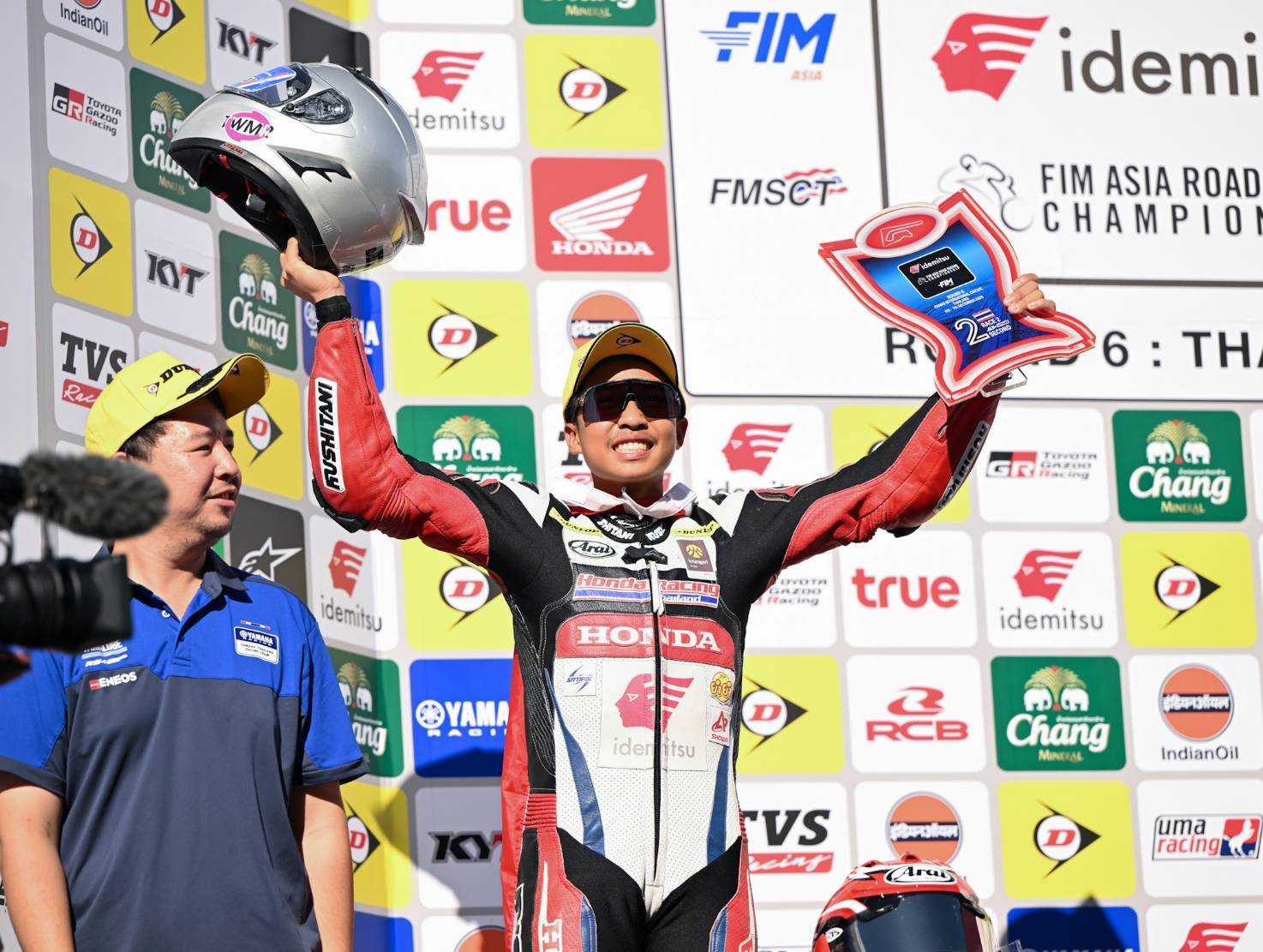 ด้านรุ่น เอเชีย โปรดักชั่น 250 (AP250) สองดาวรุ่งไวล์ดการ์ดก้าวข้ามขีดจำกัดของประสบการณ์อีกครั้งด้วยการขึ้นมาดวลความเร็วกับนักบิดแถวหน้า โดย “อุ้ม” นพรุธพงษ์ บุญประเวศ ที่ขี่ CBR250RR หมายเลข 20 เริ่มต้นจากกริดสตาร์ตที่ 5 เริ่มต้นออกสตาร์ต บวกความเร็วแซงคู่แข่งขึ้นมาอย่างต่อเนื่อง โชว์ความมุ่งมั่นไล่ลดช่องว่างจากกลุ่มนำขึ้นมาทันในช่วง 3 รอบสุดท้ายร่วมต่อสู้เพื่อลุ้นชัยชนะในเรซ ซึ่งมีการชิงจังหวะกันถึงโค้งสุดท้าย ก่อนที่ดาวรุ่งไทย “อุ้ม-นพรุธพงษ์” จะทะยานตัวแข่งคู่กายคว้าอันดับที่ 2 ขยับผลงานอีกครั้งในเรซนี้พร้อมกับพาธงชาติไทยขึ้นโพเดียมได้สำเร็จอีกครั้ง