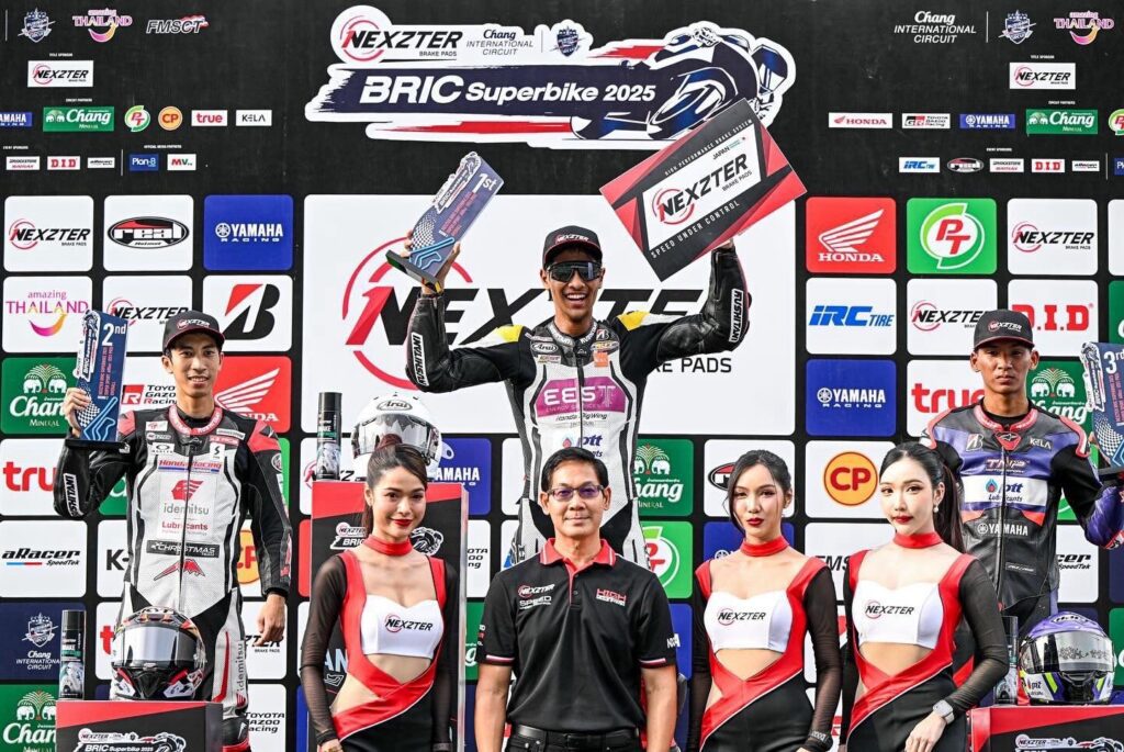 “อุ้ม” นพรุธพงษ์ บุญประเวศ ดาวรุ่งวัย 17 ปี สร้างผลงานอย่างโดดเด่นในการแข่งขันด้วยสิทธิ์ไวลด์การ์ด เขาพารถแข่ง Honda CBR250RR ขึ้นไปต่อสู้ในกลุ่มหน้ากับคู่แข่งที่ผ่านการแข่งขันระดับโลกมาแล้วอย่างสุดมันส์ ก่อนจะคว้าโพเดียมมาได้ทั้ง 2 เรซ นั่นคืออันดับ 3 จากเรซแรก และอันดับ 2 จากเรซสุดท้าย ถือเป็นการแจ้งเกิดอย่างเต็มตัว ส่วนทีมเมทอย่าง “เฟอร์” ปัญจรุจน์ จิตวิรุฬห์ฉัตร โดดเด่นไม่แพ้กันด้วยการคว้าอันดับ 6 และอันดับ 5 มาครอง