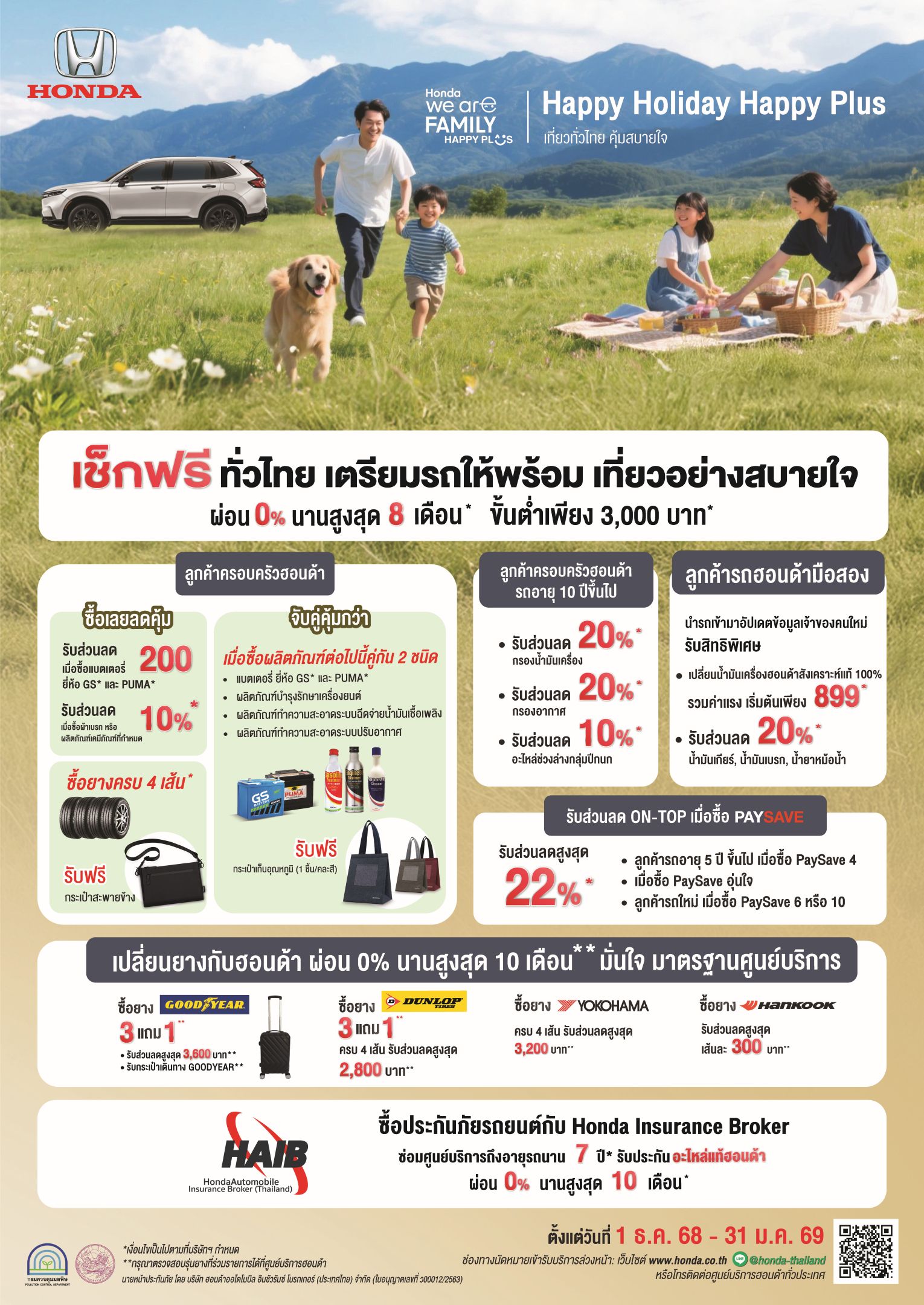 ฮอนด้า เสิร์ฟความอุ่นใจรับลมหนาว ! กับแคมเปญ “Happy Holiday Happy Plus! เที่ยวทั่วไทย คุ้มสบายใจ” บริการตรวจเช็กรถยนต์ฟรีพร้อมแพ็กเกจสุดพิเศษผ่อนสบาย 0% สูงสุด 8 เดือน* สำหรับครอบครัวฮอนด้าทุกคน ที่ศูนย์บริการทั่วประเทศ ระหว่างวันที่ 1 ธ.ค. 68 – 31 ม.ค. 69