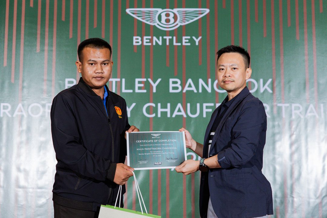 หลังจบการอบรม คุณ อภิญญา ชัยสันติกุลวัฒน์ ผู้จัดการทั่วไป พร้อมด้วย คุณ ดิษวัฒน์ รัตนไมตรีเกียรติ ผู้จัดการส่วนงานบริการหลังการขายได้ขึ้นกล่าวแสดงความยินดีและมอบประกาศนียบัตรและของที่ระลึกให้แก่ผู้เข้าร่วมการอบรมในครั้งนี้ โดย เบนท์ลีย์ แบงค็อก บริษัท เอเอเอส ออโต้ เซอร์วิส จำกัด ตั้งใจส่งมอบประสบการณ์หลังการขายเพื่อสร้างความเชื่อมั่นและความประทับใจ อีกทั้ง ความรู้และเทคนิคต่างๆ ในการขับขี่รถยนต์เบนท์ลีย์ที่สามารถนำไปปรับใช้เพื่อให้ขับขี่รถยนต์เบนท์ลีย์ได้อย่างเต็มสมรรถนะด้วยประสิทธิภาพสูงสุด และปลอดภัย ตามสโลแกนที่ว่า “เอเอเอสฯ ดูแลทั้งรถและคุณ”