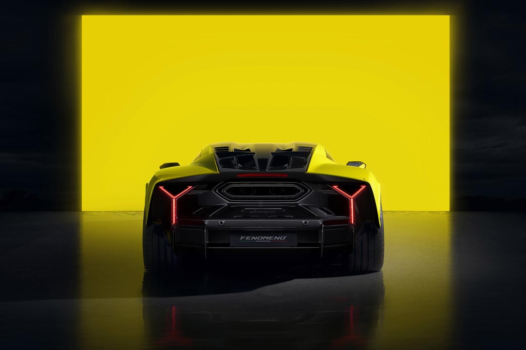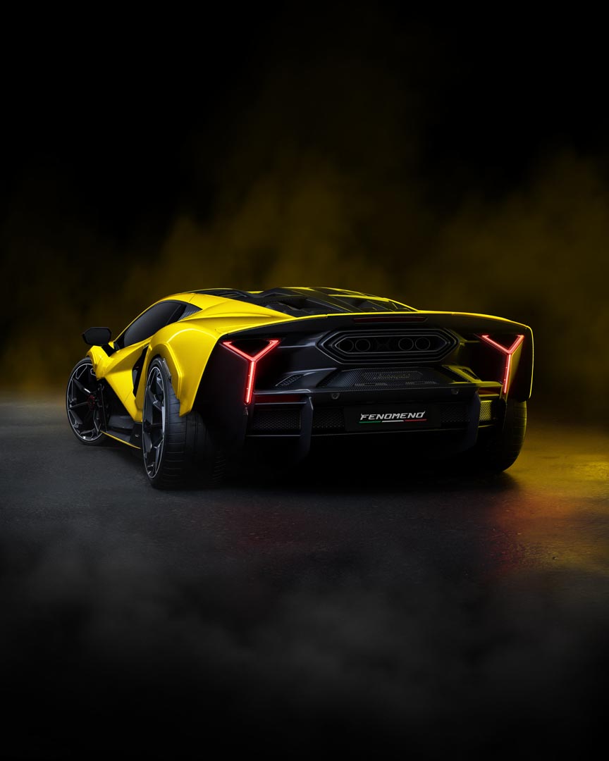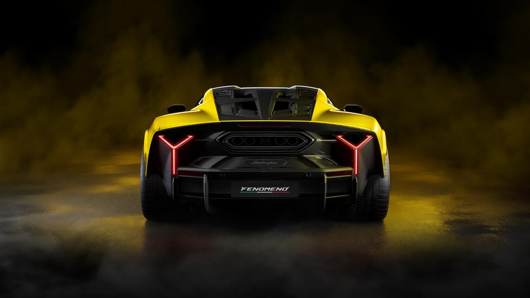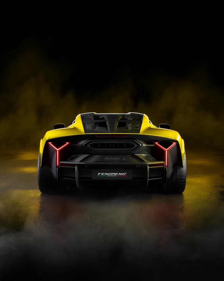 เมื่อมองจากด้านหลัง จะเห็นว่า Fenomeno เป็นรถยนต์ที่ไม่มีรุ่นใดเทียบได้ในประวัติศาสตร์การออกแบบของลัมโบร์กินี ด้วยเส้นสายที่ต่อเนื่องเชื่อมโยงระหว่างปีกและซุ้มล้อ ช่วยแบ่งขอบเขตระหว่างตัวถังรถและส่วนท้ายให้เห็นอย่างชัดเจน รวมถึงเอกลักษณ์เฉพาะตัวของไฟส่องสว่างอันล้ำสมัย การตีความตัวอักษร Y อันเป็นเอกลักษณ์ในแนวตั้ง ซึ่งเชื่อมโยงองค์ประกอบคาร์บอนไฟเบอร์ของดิฟฟิวเซอร์เข้ากับเส้นสายหกเหลี่ยมที่เด่นชัดของครอบปลายท่อไอเสีย