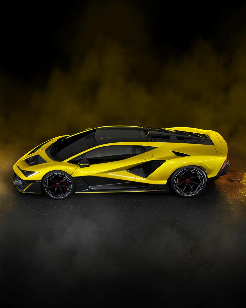 มุมมองด้านข้างสะท้อนภาพลักษณ์ของลัมโบร์กินีในแบบฉบับดั้งเดิม ผ่านเส้นสายเชิงเดี่ยวที่เน้นรูปทรงของตัวรถตั้งแต่ปลายฝากระโปรงหน้าจรดส่วนท้าย ซึ่งได้แรงบันดาลใจจาก “ดีไซน์ลองเทล (Long tail)” ของรุ่น Essenza SCV12 การเลือกโทนสีของชุดตกแต่งเน้นย้ำถึงความแข็งแกร่งของตัวรถส่วนบน ซึ่งตัดกันอย่างสง่างามกับเทคนิคการออกแบบด้านอากาศพลศาสตร์อย่างมีสไตล์ในส่วนล่างของตัวรถ ซึ่งติดตั้งครีบคาร์บอนไฟเบอร์ของรุ่นรถแข่งเพื่อเสริมแรงด้านอากาศพลศาสตร์ เช่นเดียวกับการออกแบบซุ้มล้อ