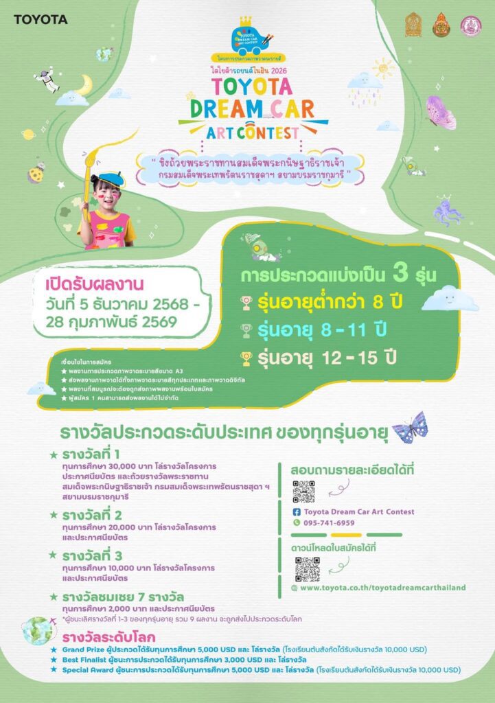 บริษัท โตโยต้า มอเตอร์ ประเทศไทย จำกัด เดินหน้าเปิดโครงการประกวดวาดภาพระบายสี ซึ่งดำเนินงานมาอย่างต่อเนื่องเป็นปีที่ 15 เชิญชวนเด็กและเยาวชนอายุไม่เกิน 15 ปี ส่งผลงานเข้าร่วมประกวดในโครงการ “โตโยต้า รถยนต์ในฝัน” “TOYOTA Dream Car Art Contest 2026” ชิงถ้วยพระราชทาน สมเด็จพระกนิษฐาธิราชเจ้า กรมสมเด็จพระเทพรัตนราชสุดาฯ สยามบรมราชกุมารี พร้อมโอกาสในการเป็นตัวแทนประเทศไทย ชิงรางวัลระดับโลกที่ประเทศญี่ปุ่น