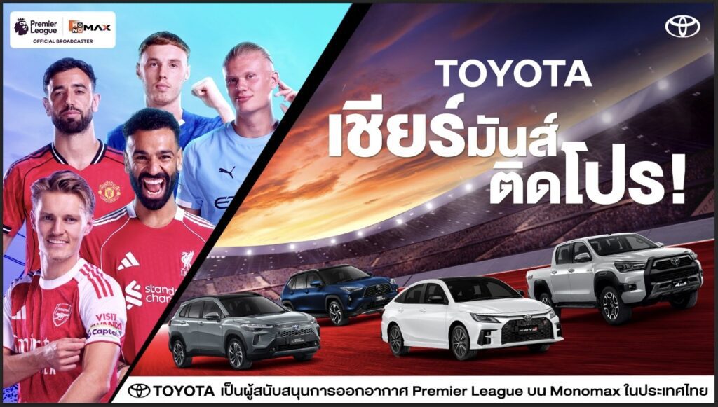 บริษัท โตโยต้า มอเตอร์ ประเทศไทย จำกัด ร่วมมือกับบริษัท โมโนสตรีมมิ่ง จำกัด หรือ Monomax แพลตฟอร์มหลักในการถ่ายทอดสด และ บริษัท จัสมิน อินเตอร์เนชั่นแนล จำกัด (มหาชน) หรือ JAS ผู้ถือลิขสิทธิ์การถ่ายทอดสดฟุตบอลพรีเมียร์ลีก และ เอมิเรตส์ เอฟเอ คัพ อย่างเต็มรูปแบบในประเทศไทย ผนึกกำลังขับเคลื่อนประสบการณ์การรับชมฟุตบอลของชาวไทยไปสู่อีกระดับ โดยการเป็นผู้สนับสนุนการออกอากาศ Premier League บน Monomax อย่างเป็นทางการ พร้อมเปิดตัวแคมเปญใหญ่ ‘เชียร์มันส์ ติดโปร’ มอบสิทธิพิเศษมูลค่ากว่า 10 ล้านบาทตลอดฤดูกาล 2025/26
