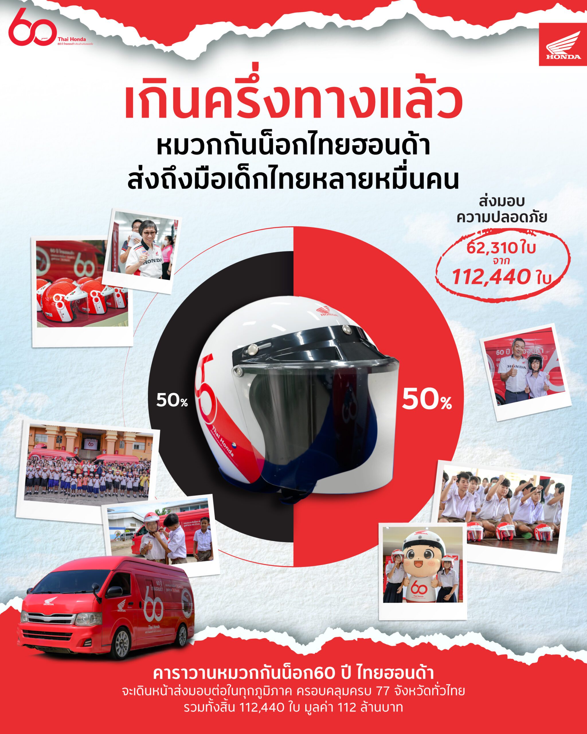 ไทยฮอนด้า เดินหน้าเกินครึ่งทาง คาราวานหมวกกันน็อก 60 ปี ส่งมอบ 62,310 ใบ จากเป้าหมาย 112,410 ใบ ทั่วประเทศ