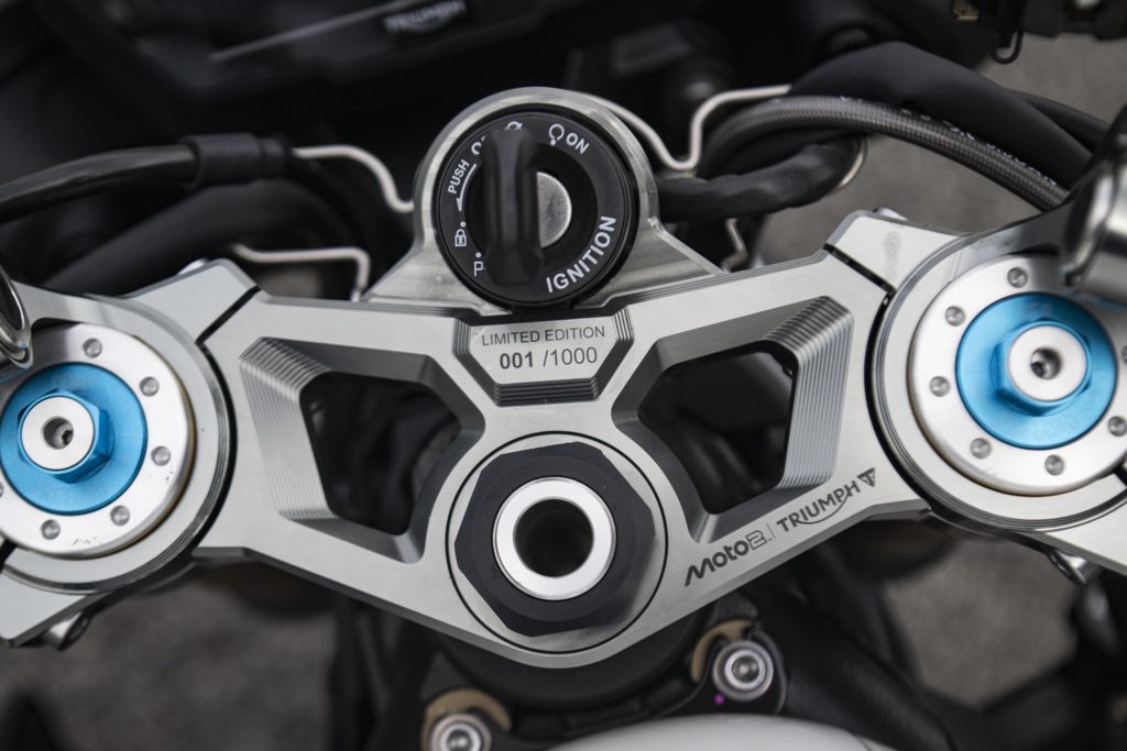 รถจักรยานยนต์ Street Triple Moto2™ Edition แต่ละคันจะมีหมายเลขกำกับประจำตัวที่ไม่ซ้ำกันบนแผงคอที่ขึ้นรูปเป็นพิเศษ ซึ่งสลักโลโก้ Moto2™ อยู่ด้วย โดยติดตั้งอยู่ข้างจอแสดงผล TFT ที่ทุกครั้งที่หน้าจอเริ่มต้นการทำงาน จะมีโลโก้ Moto2™ ปรากฏขึ้น นอกจากนี้ยังจะมีการสลักชื่อและตราสัญลักษณ์ Triumph Triple Trophy ลงไปเพื่อเพิ่มความพิเศษ ตอกย้ำสถานะความเป็นรถรุ่นลิมิเต็ด เอดิชันและดึงดูดความน่าสนใจสำหรับนักสะสม