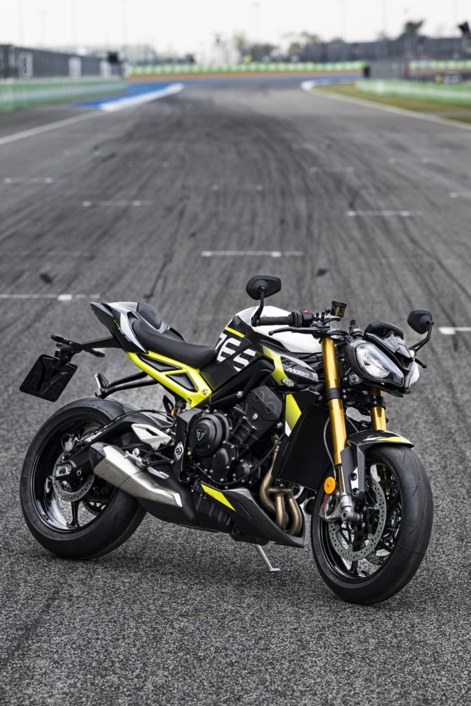 รุ่นที่พัฒนาจากสนามแข่งนี้ มาพร้อมรายละเอียดระดับพรีเมียมที่ได้รับแรงบันดาลใจจากรถแข่ง ไม่ว่าจะเป็นแผงข้างคาร์บอนไฟเบอร์ บังโคลนหน้า แผงใต้ท้องรถ และปลายท่อไอเสีย เพื่อมอบความเบาสบายและภาพลักษณ์ล้ำสมัย มาพร้อมเบาะลายปั๊มนูนสัญลักษณ์ Moto2™ เพื่อเพิ่มการยึดเกาะและการทรงตัวให้กับผู้ขับขี่ ไฟท้ายแบบเลนส์ใส และโลโก้ Moto2™ ที่สลักด้วยเลเซอร์บนท่อไอเสีย โดดเด่นด้วยโทนสี Mineral Grey & Crystal White ตัดกับซับเฟรมด้านท้ายสี Triumph Performance Yellow และแถบล้อหลังสีเดียวกัน สร้างภาพลักษณ์ที่สะท้อนจิตวิญญาณแห่งรถแข่งอย่างชัดเจน