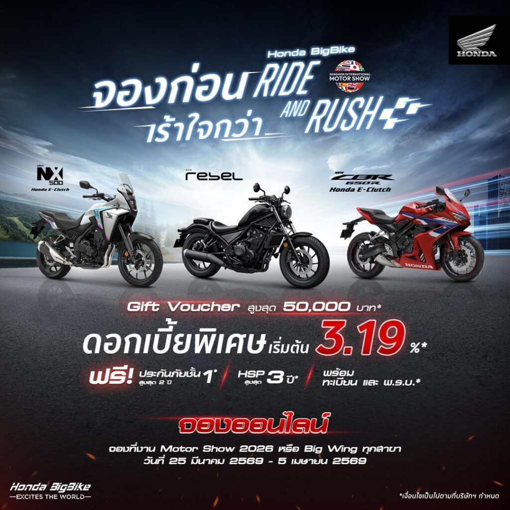 รถจักรยานยนต์ฮอนด้า มอบโปรฯ เดือด “RIDE AND RUSH จองก่อนเร้าใจกว่า” จัดเต็มดอกเบี้ยพิเศษและข้อเสนอสุดคุ้มในงาน Motor Show 2026 เท่านั้น