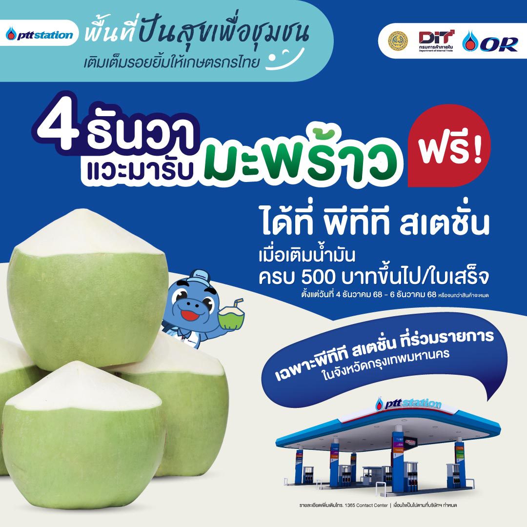 คุณวิทยากร มณีเนตร อธิบดีกรมการค้าภายใน พร้อมด้วย คุณพิมาน พูลศรี รองประธานเจ้าหน้าที่บริหารด้านธุรกิจค้าปลีกน้ำมัน บริษัท ปตท. น้ำมันและการค้าปลีก จำกัด (มหาชน) (OR) ร่วมเปิดกิจกรรม “เติมเต็มรอยยิ้มให้เกษตรกรไทย เติมน้ำมันรับฟรี มะพร้าว” ณ พีทีที สเตชั่น ในพื้นที่กรุงเทพฯ รวม 188 สถานี เพื่อช่วยเหลือเกษตรกรไทยในช่วงที่ผลผลิตล้นตลาด พร้อมส่งต่อผลไม้คุณภาพจากแหล่งผลิตโดยตรงสู่มือผู้บริโภค โดย พีทีที สเตชั่น ได้รับซื้อมะพร้าวจากเกษตรกรผู้ปลูกมะพร้าว เพื่อส่งมอบเป็นของขวัญแทนคำขอบคุณให้กับลูกค้าที่เติมน้ำมันครบ 500 บาทขึ้นไปต่อใบเสร็จ รับฟรีมะพร้าว 1 ลูก (จำกัด 1 ลูก/ใบเสร็จ) โดยรวมแล้วมีการจัดสรรผลผลิตกว่า 20,000 ลูก เพื่อกระจายให้กับลูกค้าในสถานีบริการที่ร่วมรายการ ระหว่างวันที่ 4 – 6 ธันวาคม 2568 หรือจนกว่าสินค้าจะหมด