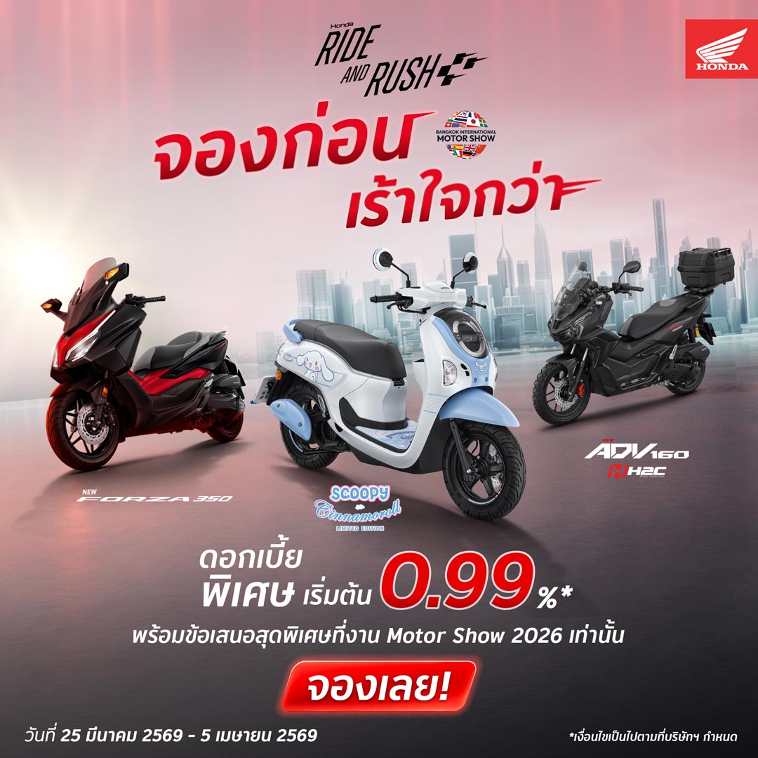รถจักรยานยนต์ฮอนด้า มอบโปรฯ เดือด “RIDE AND RUSH จองก่อนเร้าใจกว่า” จัดเต็มดอกเบี้ยพิเศษและข้อเสนอสุดคุ้มในงาน Motor Show 2026 เท่านั้น