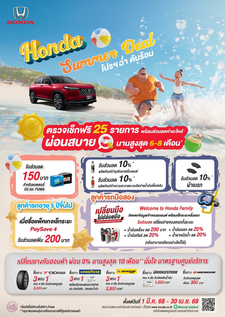 ลูกค้ารถยนต์ฮอนด้า ทั้งรถใหม่และรถมือสอง เตรียมเฮ! รับซัมเมอร์กับบริการตรวจสภาพรถฟรี! 25 รายการ จัดแคมเปญ “Honda Summer Deal”* โดย บริษัท ฮอนด้า ออโตโมบิล (ประเทศไทย) จำกัด ร่วมกับกรมการขนส่งทางบก ชวนลูกค้าเตรียมความพร้อมให้รถยนต์ฮอนด้าของท่านก่อนการเดินทางช่วงฤดูร้อนและเทศกาลสงกรานต์ ด้วยบริการตรวจสภาพรถยนต์ฟรี 25 รายการ รับโปรโมชันพิเศษ ทั้งแบตเตอรี่ ยางรถยนต์ ผ้าเบรก และส่วนลดอะไหล่อื่นๆ มากมาย พร้อมผ่อนเบาๆ สุดคุ้ม สูงสุด 10 เดือน** เพียงนำรถเข้ารับบริการที่ศูนย์บริการฮอนด้าใกล้บ้านท่าน ตั้งแต่วันที่ 1 มีนาคม 2568 – 30 เมษายน 2568 โดยสามารถจองคิวรับบริการล่วงหน้า ทาง “Online Service Booking” ที่ https://servicebooking.honda.co.th หรือทาง LINE Official Account (@Honda-Thailand) มาพร้อม 2 บริการพิเศษ*** ทั้ง “Honda Drop & Go” การนัดหมายเช็กระยะล่วงหน้า และ “Honda Quick Service” การนัดหมายเช็กระยะเร่งด่วน แบบรอรับรถได้ภายในเวลาที่กำหนด เพื่อมอบความสะดวกสบายให้ลูกค้าทุกท่านยิ่งขึ้น