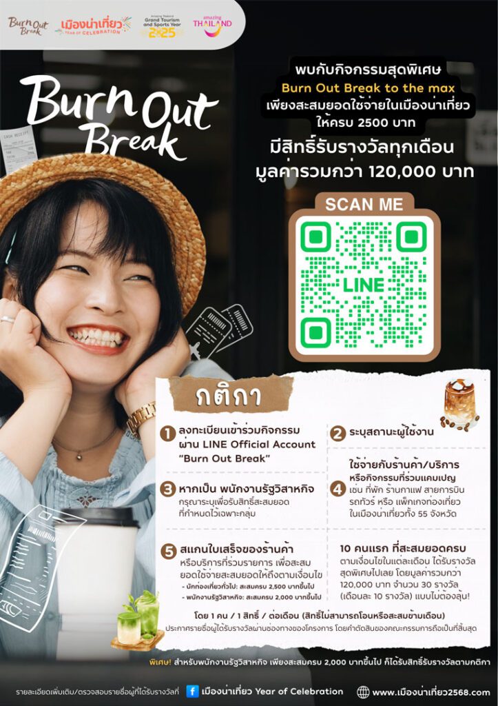 นอกจากโปรดีๆ แล้ว ยังมีกิจกรรมให้ร่วมสนุกกับ “Burn Out Break to the Max” ลุ้นรับรางวัลใหญ่รวมมูลค่ากว่า 120,000 บาท! เพียงสะสมยอดใช้จ่ายจากร้านค้าพันธมิตร (ร้านกาแฟ, ที่พัก, รถทัวร์, สายการบิน, แพ็กเกจเที่ยว) โดยสแกนใบเสร็จผ่าน LINE OA: Burn Out Break