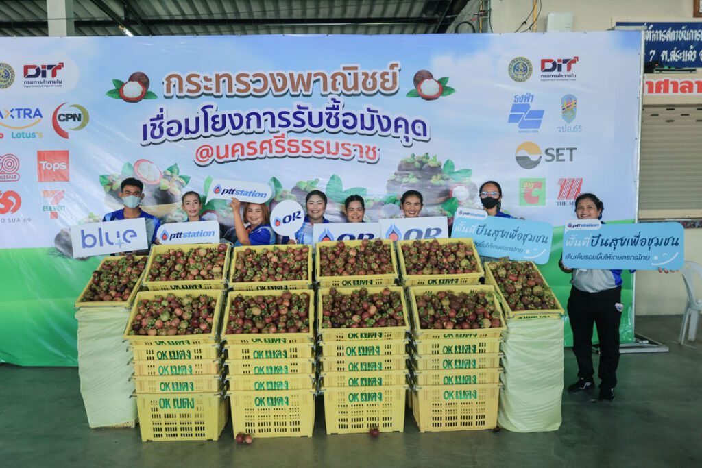 คุณจตุพร บุรุษพัฒน์ รัฐมนตรีว่าการกระทรวงพาณิชย์ พร้อมด้วย คุณสุชาติ ชมกลิ่น รัฐมนตรีช่วยว่าการฯ ร่วมลงพื้นที่พบปะเกษตรกร เชื่อมโยงซื้อขายมังคุดจากเกษตรกรสู่ช่องทางการตลาดใหม่ ๆ เพื่อกระจายผลผลิตไปสู่ห้างค้าส่ง-ค้าปลีก และสถานีบริการน้ำมันเชื้อเพลิง โดยมี คุณณัฐวัฒน์ รัฐวิวรรธน์ ผู้จัดการฝ่ายบริหารสถานีบริการส่วนภูมิภาค OR ร่วมลงพื้นที่ ณ กลุ่มมังคุดบ้านนากุน หมู่ที่ 6 ตำบลสระแก้ว อำเภอท่าศาลา จังหวัดนครศรีธรรมราช ในการนี้ OR ได้เข้าร่วมเป็นพันธมิตรสำคัญในการรับซื้อผลผลิตมังคุดจากเกษตรกรโดยตรง และกระจายผ่านสถานีบริการ พีทีที สเตชั่น ซึ่งเป็นหนึ่งในกลยุทธ์ต่อยอดจากโครงการช่วยเหลือผลไม้ภาคตะวันออกเมื่อเดือนมิถุนายนที่ผ่านมา