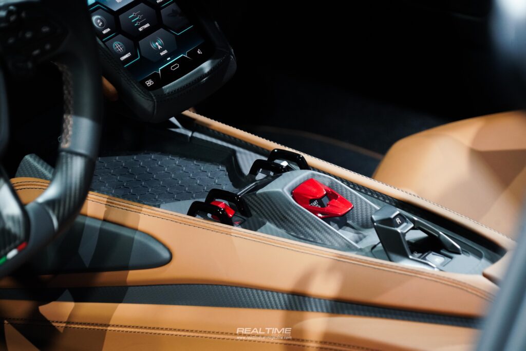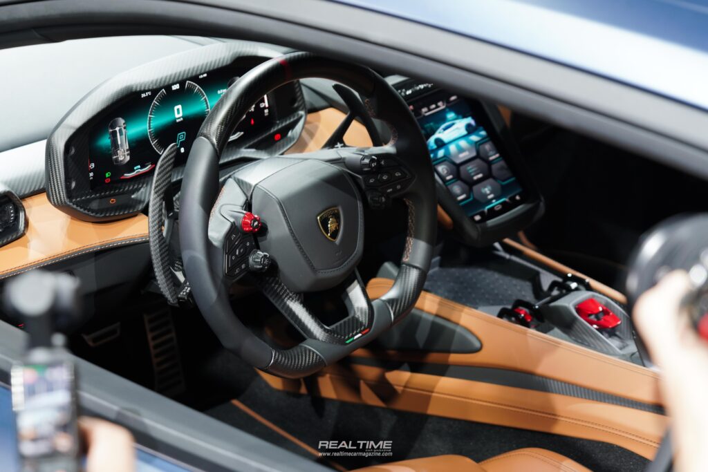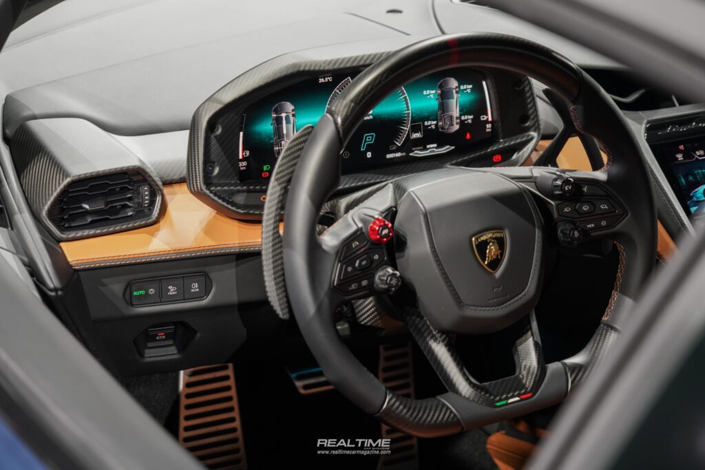 ภายในห้องโดยสารสะท้อนดีไซน์ภายนอกอันโดดเด่น โดยผสมผสานประสบการณ์ดิจิทัลเข้ากับประสาทสัมผัสได้อย่างลงตัว โดยลัมโบร์กินีเลือกใช้วัสดุคุณภาพสูงสุด อาทิ คาร์บอน หนัง และไมโครไฟเบอร์ Dinamica® Corsatex Suede ทั่วทั้งห้องโดยสาร พร้อมกันนี้ องค์ประกอบการตกแต่งภายใน เช่น คอนโซลกลาง ช่องระบายอากาศ แผงประตู แดชบอร์ด พวงมาลัย และคอพวงมาลัย ยังมีให้เลือกใช้วัสดุคาร์บอนไฟเบอร์น้ำหนักเบาเป็นออปชันเสริมอีกด้วย