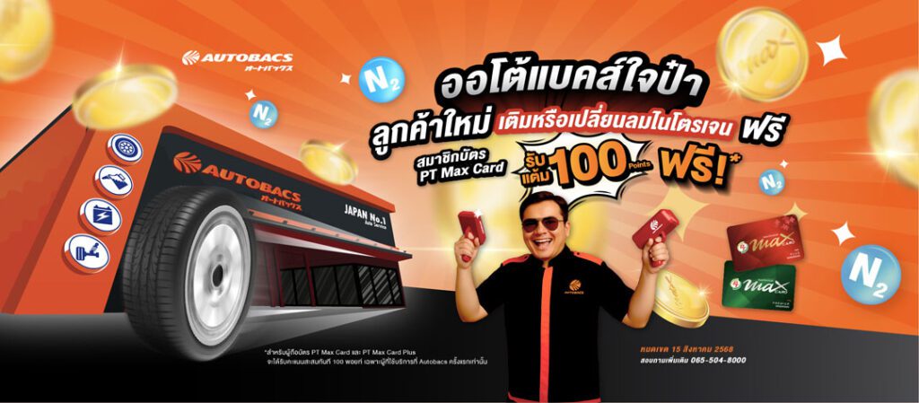 ออโต้แบคส์จัดเต็ม! สำหรับลูกค้าใหม่ เติมหรือเปลี่ยนลมไนโตรเจนฟรี! ผู้ถือบัตร PT Max Card รับคะแนนสะสม PT Max Card Points ฟรี! 100 คะแนน
