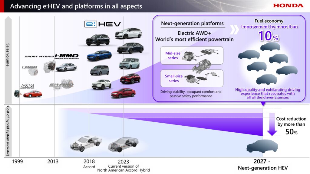 1) การพัฒนาแพลตฟอร์มเจเนอเรชันใหม่ที่ล้ำสมัย มีเสถียรภาพในการขับขี่และน้ำหนักที่ลดลง และ 2) ระบบมอเตอร์ไฟฟ้าขับเคลื่อนสี่ล้อ (Electric AWD) ที่พัฒนาใหม่ ที่มอบการควบคุมที่แม่นยำและการตอบสนองของมอเตอร์ที่ทันใจ - ตั้งเป้าพัฒนาระบบขับเคลื่อนฟูลไฮบริด e:HEV เจเนอเรชันใหม่ ให้มีอัตราการสิ้นเปลืองน้ำมันที่ดีขึ้น 10% รวมถึงเพิ่มขีดความสามารถในการแข่งขันด้านต้นทุนให้กับรถไฮบริด (HEV) ของฮอนด้า และปรับต้นทุนของระบบฯ ลง 50% เมื่อเทียบกับระบบไฮบริดที่ติดตั้งในรถยนต์ที่เปิดตัวรุ่นปี 2018 และลดลงกว่า 30% เมื่อเทียบกับระบบไฮบริดที่ติดตั้งในรถยนต์ที่เปิดตัวในปี 2023 ในรุ่นปัจจุบัน