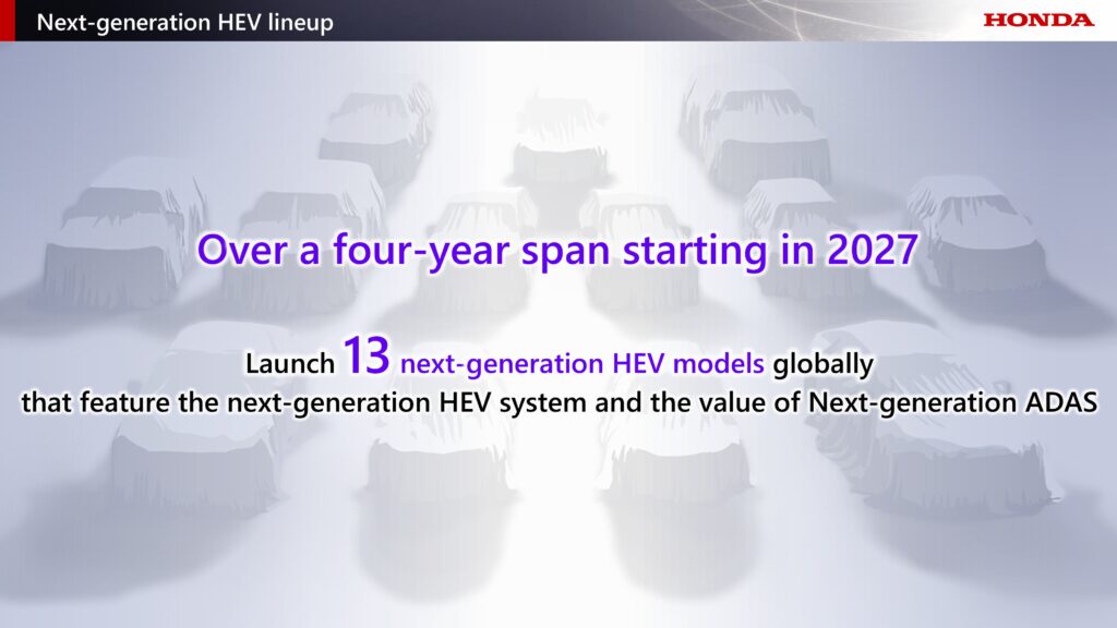 - มีแผนเปิดตัวรถไฮบริด (HEV) เจเนอเรชันใหม่ของฮอนด้า รวมทั้งหมด 13 รุ่นทั่วโลก ภายในระยะเวลา 4 ปี นับตั้งแต่ปี 2027 เพื่อขยายไลน์อัปไฮบริด (HEV) ให้ครอบคลุมและตอบรับกับความต้องการของตลาดที่เพิ่มขึ้นอย่างต่อเนื่อง
