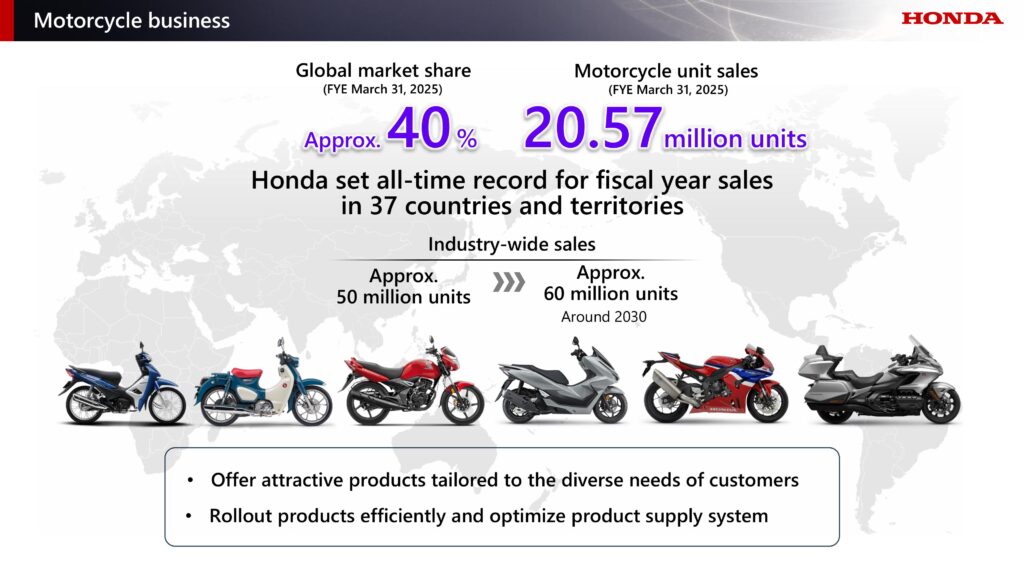 สำหรับปีงบประมาณล่าสุด ซึ่งสิ้นสุดลงเมื่อวันที่ 31 มีนาคม 2025 ที่ผ่านมา ฮอนด้า มียอดจำหน่ายรถจักรยานยนต์รวมทั้งสิ้น 20.57 ล้านคัน คิดเป็นสัดส่วนกว่า 40% ของยอดขายรวมในตลาดรถจักรยานยนต์ทั่วโลก โดยความสำเร็จครั้งนี้ยังสร้างสถิติยอดขายสูงสุดเป็นประวัติการณ์ใน 37 ประเทศและภูมิภาคอีกด้วย ทั้งนี้ คาดว่าความต้องการในตลาดรถจักรยานยนต์จะยังคงเติบโตอย่างต่อเนื่อง โดยเฉพาะในกลุ่มประเทศกำลังพัฒนา รวมถึงประเทศอินเดีย ซึ่งเป็นตลาดรถจักรยานยนต์ใหญ่ที่สุดในโลก อันเนื่องมาจากการขยายตัวของประชากรและระดับรายได้ที่เพิ่มสูงขึ้น โดยคาดการณ์ว่า ยอดขายรวมของอุตสาหกรรมจะเพิ่มขึ้นจากระดับปัจจุบันประมาณ 50 ล้านคัน เป็น 60 ล้านคันภายในปี 2030