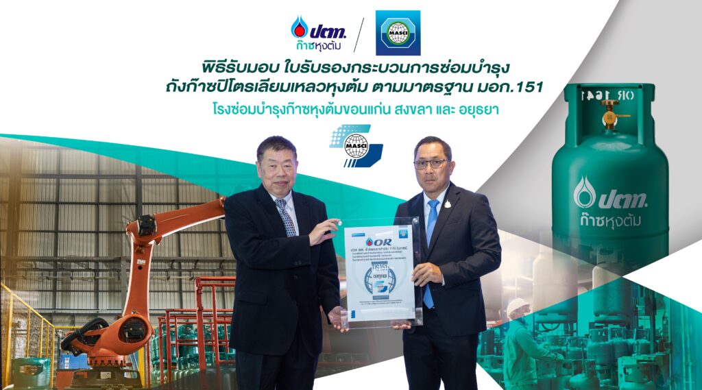 หม่อมหลวงปีกทอง ทองใหญ่ ประธานเจ้าหน้าที่บริหาร บริษัท ปตท. น้ำมันและการค้าปลีก จำกัด (มหาชน) (OR) รับมอบใบรับรองกระบวนการซ่อมบำรุงถังก๊าซปิโตรเลียวเหลวหุงต้ม ตามมาตรฐาน มอก.151 จาก คุณจงรักษ์ โรจน์พลาเสถียร ผู้อำนวยการสถาบันรับรองมาตรฐานไอเอสโอ ตอกย้ำความมั่นใจให้ผู้บริโภคก๊าซหุงต้ม ปตท. ผ่านการยกระดับมาตรฐานด้านความปลอดภัยอย่างต่อเนื่อง โดยโรงซ่อมถังก๊าซหุงต้ม ปตท. ทั้ง 3 แห่ง ได้แก่ โรงซ่อมถังก๊าซหุงต้ม ปตท. จ.พระนครศรีอยุธยา สงขลา และ ขอนแก่น ผ่านการรับรองกระบวนการซ่อมบำรุงถังก๊าซปิโตรเลียวเหลวหุงต้ม ตามมาตรฐาน มอก.151 ซึ่งเป็นมาตรฐานกระบวนการซ่อมบำรุง การตรวจสอบ และ การทดสอบถังก๊าซปิโตรเลียมเหลวหุงต้ม ที่กำหนดโดยสำนักงานมาตรฐานผลิตภัณฑ์อุตสาหกรรม (สมอ.) กระทรวงอุตสาหกรรม ถือเป็นบริษัทแรกของประเทศไทยที่ผ่านการรับรองในกระบวนการนี้