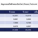 - รถจักรยานยนต์มีจำนวนทั้งสิ้น 9,569 คัน เพิ่มขึ้นจากช่วงเวลาเดียวกันปี 2567 ร้อยละ 4.60