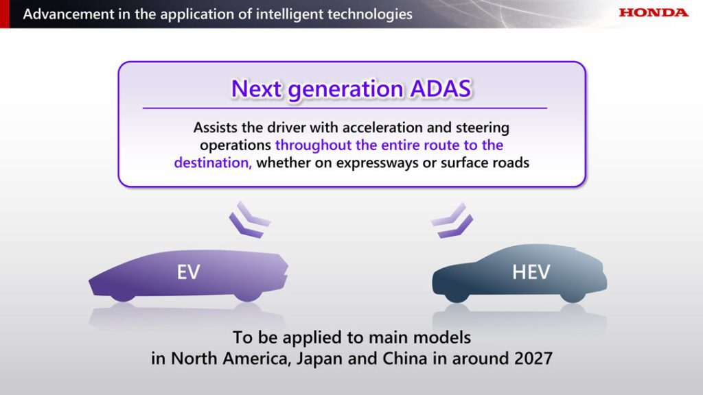 การขับขี่อัตโนมัติ - โดยฮอนด้ามีแผนในการติดตั้งระบบช่วยเหลือผู้ขับขี่ขั้นสูง (ADAS) เจเนอเรชันใหม่ ในรถยนต์ไฟฟ้า (EV) และรถไฮบริด (HEV) รุ่นหลัก ๆ ที่เตรียมเปิดตัวในอเมริกาเหนือและญี่ปุ่น ในปี 2027