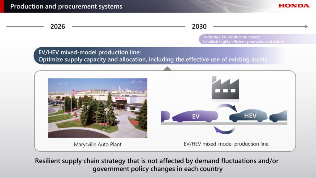รวมถึงปรับแผนเปิดตัวรถใหม่ เนื่องด้วยการชะลอตัวของตลาด EV ทั่วโลกที่ส่งผลให้เป้าหมายสัดส่วนยอดขาย EV ทั่วโลกของฮอนด้าในปี 2030 อาจต่ำกว่าเป้าหมาย 30% จากที่เคยคาดการณ์ไว้ก่อนหน้า โดยนับจากนี้จะเน้นขุมพลังไฮบริด เป็นหลักในการเปลี่ยนผ่านเข้าสู่ยุคยานยนต์ไฟฟ้าอย่างเต็มรูปแบบ โดยเฉพาะรถยนต์ไฮบริด (HEV) เจเนอเรชันใหม่ที่จะเปิดตัวตั้งแต่ปี 2027 เป็นต้นไป พร้อมเร่งขยายไลน์อัปไฮบริดอย่างต่อเนื่อง ซึ่งจากการปรับแนวทางนี้ ฮอนด้า ตั้งเป้าที่จะเพิ่มยอดขายในปี 2030 ให้มากกว่าระดับปัจจุบันที่ 3.6 ล้านคัน โดยมีเป้าหลักอยู่ที่ยอดขายรถยนต์ไฮบริด (HEV) ที่ 2.2 ล้านคัน