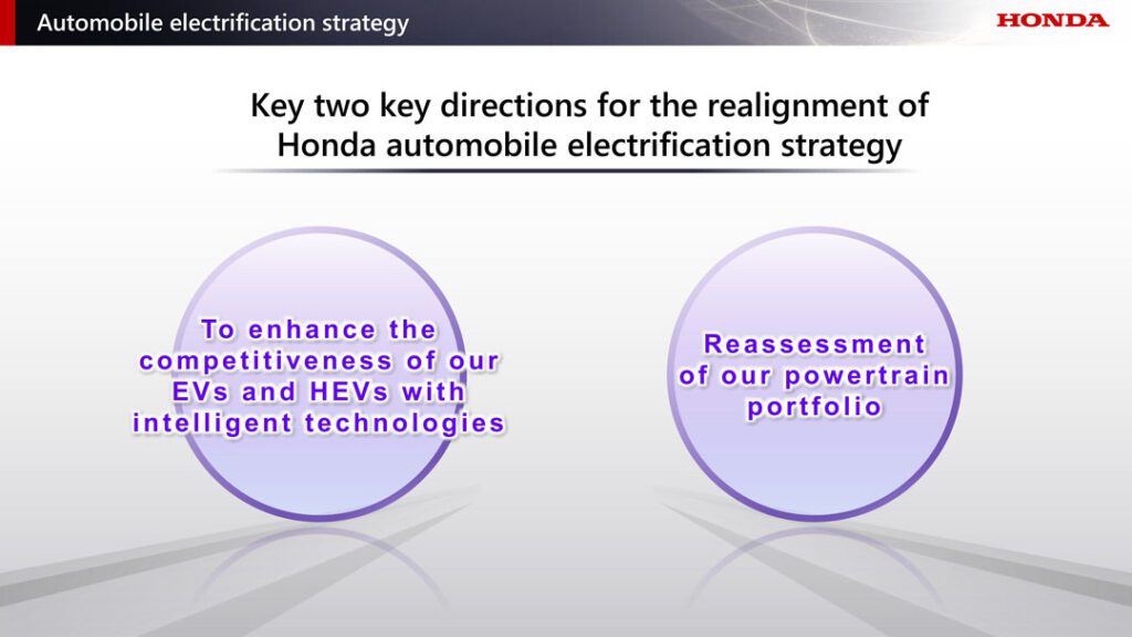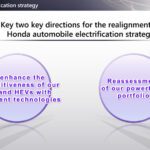โดย ฮอนด้า จะปรับกลยุทธ์ธุรกิจยานยนต์ไฟฟ้า ภายใต้ 2 ทิศทาง คือ เพิ่มขีดความสามารถในการแข่งขันของรถยนต์ไฟฟ้า (EV) และรถยนต์ไฮบริด (HEV) ผ่านการประยุกต์ใช้เทคโนโลยีอัจฉริยะ และเสริมรากฐานธุรกิจให้แข็งแกร่ง ผ่านการปรับพอร์ตโฟลิโอด้านระบบขับเคลื่อนใหม่ อีกทั้งเตรียมพัฒนาระบบช่วยเหลือผู้ขับขี่ (ADAS) เจเนอเรชันใหม่ พร้อมผนวกความร่วมมือกับพาร์ทเนอร์ทางธุรกิจ