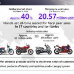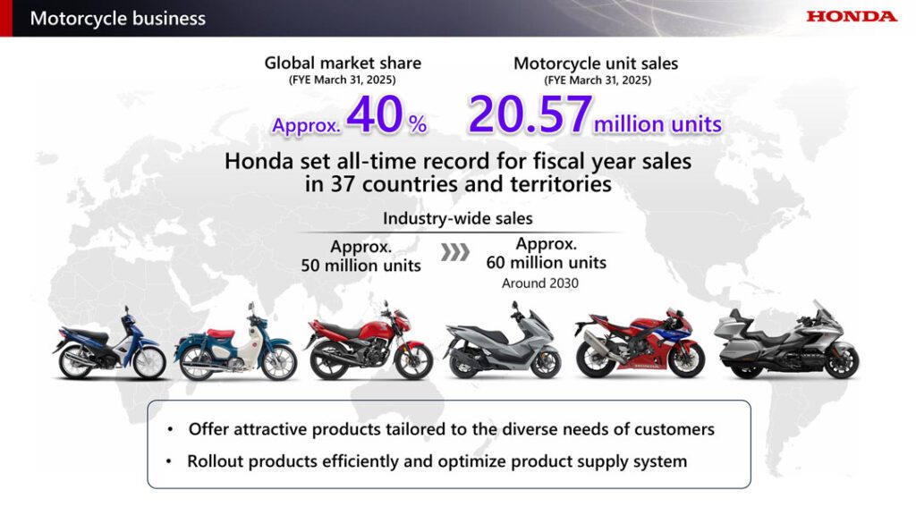 สำหรับปีงบประมาณล่าสุด ซึ่งสิ้นสุดลงเมื่อวันที่ 31 มีนาคม 2025 ที่ผ่านมา ฮอนด้า มียอดจำหน่ายรถจักรยานยนต์รวมทั้งสิ้น 20.57 ล้านคัน คิดเป็นสัดส่วนกว่า 40% ของยอดขายรวมในตลาดรถจักรยานยนต์ทั่วโลก โดยความสำเร็จครั้งนี้ยังสร้างสถิติยอดขายสูงสุดเป็นประวัติการณ์ใน 37 ประเทศและภูมิภาคอีกด้วย ทั้งนี้ คาดว่าความต้องการในตลาดรถจักรยานยนต์จะยังคงเติบโตอย่างต่อเนื่อง โดยเฉพาะในกลุ่มประเทศกำลังพัฒนา รวมถึงประเทศอินเดีย ซึ่งเป็นตลาดรถจักรยานยนต์ใหญ่ที่สุดในโลก อันเนื่องมาจากการขยายตัวของประชากรและระดับรายได้ที่เพิ่มสูงขึ้น โดยคาดการณ์ว่า ยอดขายรวมของอุตสาหกรรมจะเพิ่มขึ้นจากระดับปัจจุบันประมาณ 50 ล้านคัน เป็น 60 ล้านคันภายในปี 2030