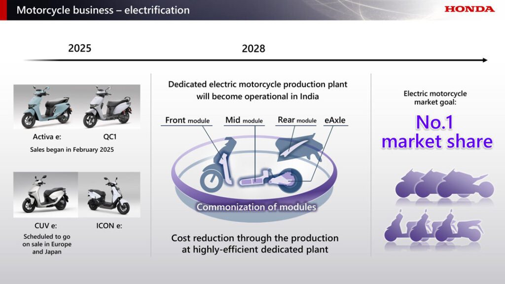สำหรับรุ่น CUV e: ฮอนด้ามีกำหนดวางจำหน่ายในภูมิภาคยุโรปและประเทศญี่ปุ่นภายในปีนี้ โดยฮอนด้าจะดำเนินการพัฒนาโมเดลไฟฟ้า พร้อมทั้งจัดตั้งโรงงานผลิตรถจักรยานยนต์ไฟฟ้าโดยเฉพาะที่มีประสิทธิภาพสูงในประเทศอินเดีย ซึ่งคาดว่าจะเริ่มดำเนินการผลิตได้ในปี 2028 ทั้งนี้ การดำเนินการดังกล่าวจะช่วยเสริมสร้างโครงสร้างธุรกิจจักรยานยนต์ไฟฟ้าให้มีความแข็งแกร่งมากยิ่งขึ้น โดยฮอนด้าวางแผนที่จะนำเสนอรถจักรยานยนต์ไฟฟ้าในราคาที่เข้าถึงได้มากขึ้น พร้อมทั้งมุ่งมั่นที่จะก้าวขึ้นสู่การเป็นผู้นำอันดับหนึ่งในตลาดรถจักรยานยนต์ไฟฟ้าในอนาคต