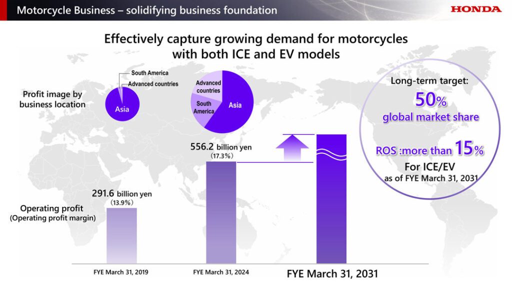 เมื่อดำเนินการเช่นนี้แล้ว ฮอนด้าจะสามารถรองรับความต้องการที่เพิ่มขึ้นได้อย่างมีประสิทธิภาพ ผ่านการเปิดตัวผลิตภัณฑ์ใหม่ที่มีความโดดเด่นและการพัฒนาระบบซัพพลายเชนที่ครอบคลุมทั้งในกลุ่มเครื่องยนต์สันดาป (ICE) และกลุ่มรถจักรยานยนต์ไฟฟ้า โดยในระยะยาว ฮอนด้าตั้งเป้าสร้างฐานธุรกิจที่มั่นคงด้วยส่วนแบ่งตลาดระดับโลกที่ 50% และอัตรากำไรจากการดำเนินงาน (ROS) มากกว่า 15% ภายในปีงบประมาณ 2531 (ซึ่งจะสิ้นสุดในวันที่ 31 มีนาคม 2031)