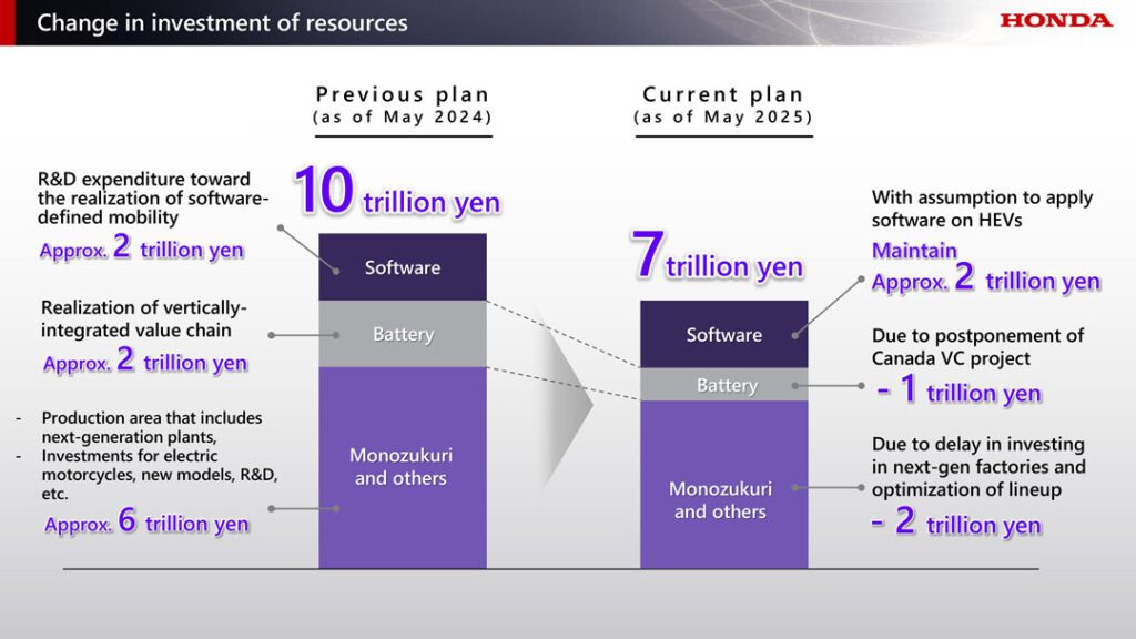 - สำหรับแผนการลงทุนในกลยุทธ์ด้าน EV ที่ประกาศไว้เมื่อปีที่ผ่านมา ซึ่งมีมูลค่า 10 ล้านล้านเยนฮอนด้า ได้ปรับลดวงเงินลงทุนลง 3 ล้านล้านเยน เหลือ 7 ล้านล้านเยน ภายในปีงบประมาณ 2031 (ปีงบประมาณที่สิ้นสุดวันที่ 31 มี.ค. 2031) โดยเป็นผลจากการตัดสินใจเลื่อนโครงการสร้าง value chain สำหรับ EV แบบครบวงจรในประเทศแคนาดา รวมถึงการยืดเวลาในการสร้างโรงงานที่จะผลิต EV เฉพาะออกไปก่อน