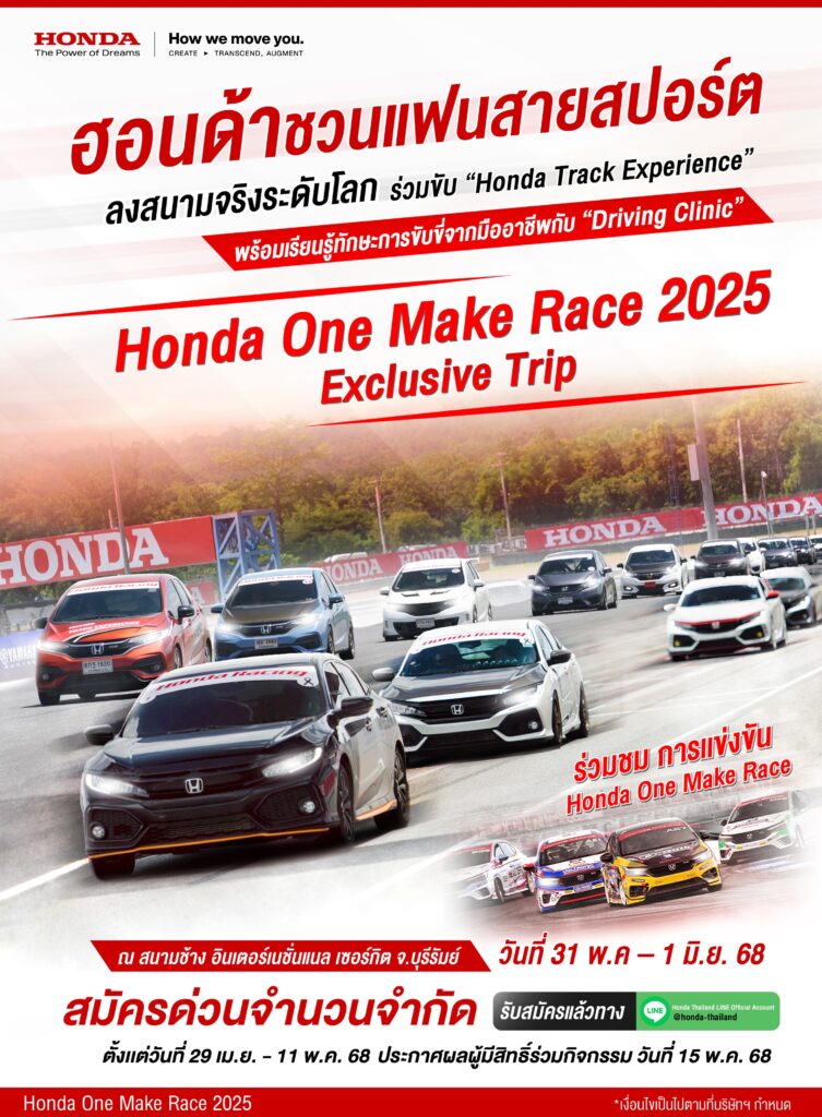 บริษัท ฮอนด้า ออโตโมบิล (ประเทศไทย) จำกัด ชวนแฟนสายสปอร์ตขับรถยนต์ฮอนด้าคู่ใจรุ่นใดก็ได้ ออกทริป 2 วัน 1 คืนกับ “Honda One Make Race 2025 Exclusive Trip” เพื่อสัมผัสประสบการณ์ความมันสุดเร้าใจกับฤดูกาลแรกของการแข่งขัน “Honda One Make Race 2025” ณ สนามช้าง อินเตอร์เนชั่นแนล เซอร์กิต จ.บุรีรัมย์ ซึ่งเป็นซัพพอร์ตเรซ (Support Race) ในการแข่งขัน “Fanatec GT World Challenge Asia 2025” การแข่งขันรถยนต์ทางเรียบระดับโลก พร้อมเสริมทักษะและเรียนรู้เทคนิคการขับขี่อย่างสนุกสนานและปลอดภัยทั้งภาคทฤษฎีและภาคปฏิบัติจากผู้เชี่ยวชาญระดับมืออาชีพกับกิจกรรม “Driving Clinic” ก่อนจับพวงมาลัยลงขับบนสนามแข่งระดับโลกแบบเอ็กซ์คลูซีฟกับกิจกรรม “Honda Track Experience” พร้อมรับสิทธิพิเศษอื่นๆ โดยกิจกรรมจะจัดขึ้นในวันเสาร์ที่ 31 พฤษภาคม – วันอาทิตย์ที่ 1 มิถุนายน 2568 ร่วมกิจกรรมกับฮอนด้าฟรี ! ไม่มีค่าใช้จ่ายเพิ่มเติม*