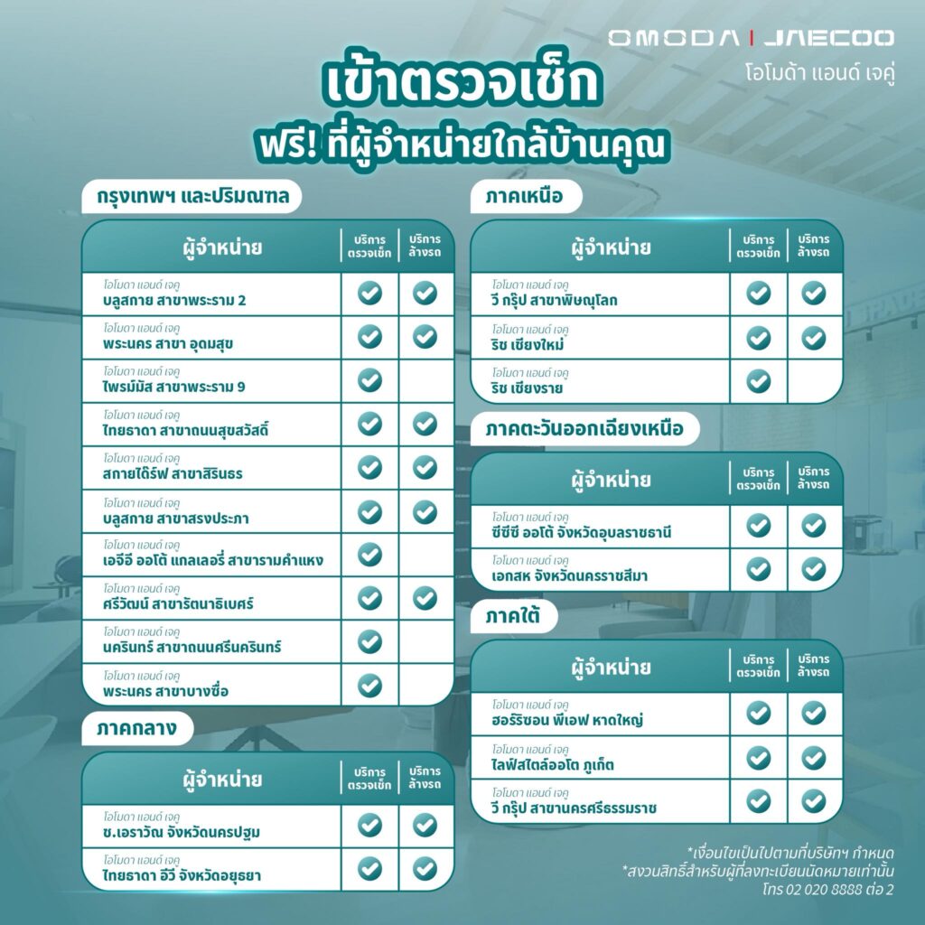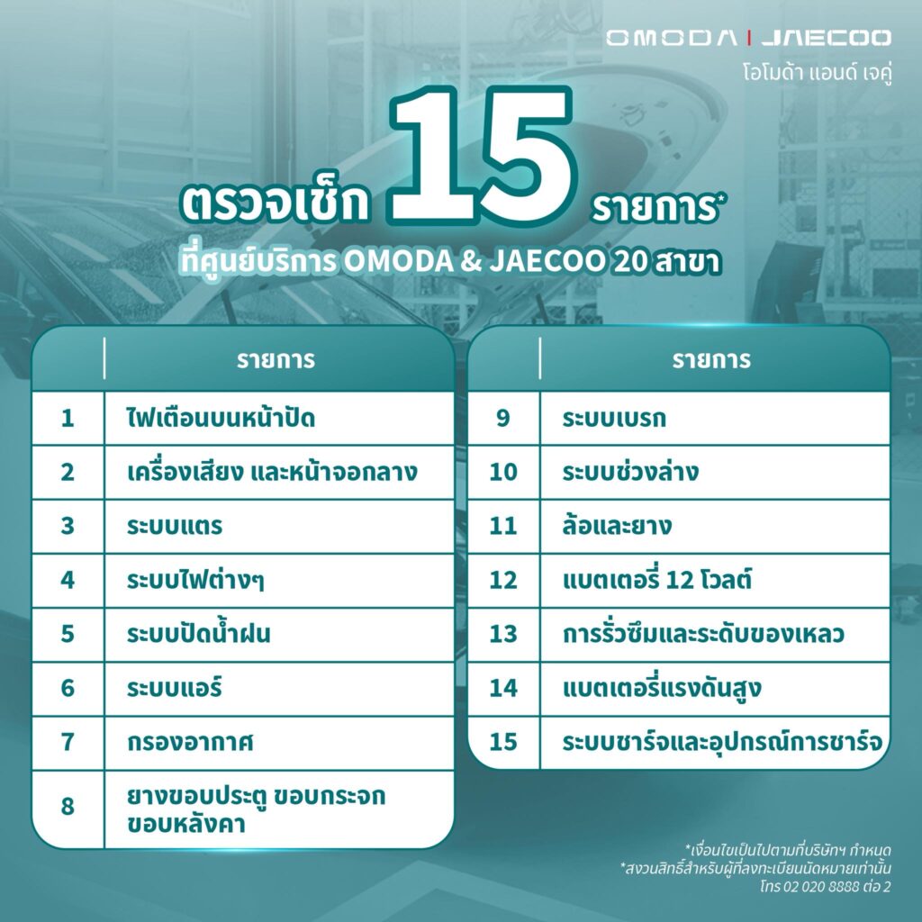 ลูกค้าสามารถนำรถยนต์ OMODA & JAECOO เข้ารับบริการตรวจเช็คฟรี 15 รายการ ที่ศูนย์บริการทั้ง 20 แห่งทั่วประเทศ พร้อมบริการล้างรถฟรีที่ศูนย์บริการ 12 แห่ง ตั้งแต่วันนี้ – 21 พฤษภาคม 2568